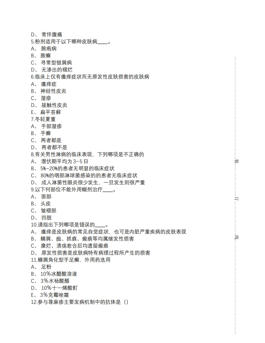 华中科技大学2021-2022学年第一学期临床医学专业《皮肤性病学》试卷(卷面100分,占总成绩%)考试日期:年月日考试时间:考试方式:闭卷题号二三四总分得分登分人核分人考试说明:1、请将选择题部分答案全部填涂在答题卡上,写在试卷上一律无效。其余试题的答案写在试卷上。2、请在答题卡上填涂好姓名、班级、课程、考试日期、试卷类型和考号。试卷类型划A;考号为学号,请填涂在“考号”的九个空格并划线。3、答题卡填涂不符合规范者,一切后果自负。即4、70分钟收取答题卡。所有试卷不得带出考场外,否则以违纪论处。一、单项选择题(每题1分,共30题,30分)1.尖锐湿疣好发于A、足跖部B、甲缘处C、头面部D、双手背E、皮肤与粘膜交界处量2.SLE发热、关节痛,治疗首选A、氨喹B、皮质类固醇激素C、左旋咪唑D、消炎痛E、硫唑嘌呤3.下列哪种是原发刺激物A、浓盐酸B、1:5000呋喃西林C、0.5%醋酸铅液D、氯霉素眼药水4.下列哪项不是慢性荨麻疹的临床表现()A、全身症状一般较轻B、反复发生达数月之久举C、风团时多时少