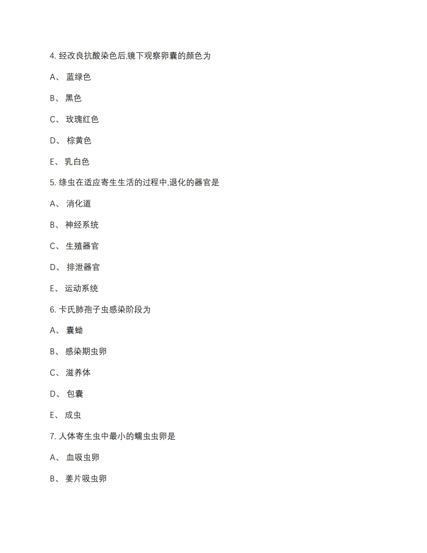 华中科技大学2019-2020学年第二学期《人体寄生虫学》课程期末考试卷一、单项选择题(本大题共30小题,每小题1分,共30分)在每小题列出的四个备选项中只有一个是符合题目要求的,请将其代码填写在题后的括号内。错选、多选或未选均无分。1.虫卵与姜片虫卵相似的寄生虫是A、肝吸虫B、肝片形吸虫C、细粒棘球绦虫D、多房棘球绦虫E、阿米巴2.根据寄生虫的生活史,下列哪种寄生虫的生活史属于间接型A、蛔虫B、钩虫C、鞭虫D、肝吸虫E、蛲虫3.下列哪种寄生虫为艾滋病患者主要致死病因之一A、隐孢子虫B、疟原虫C、阿米巴D、肉孢子虫E、卡氏肺孢子虫