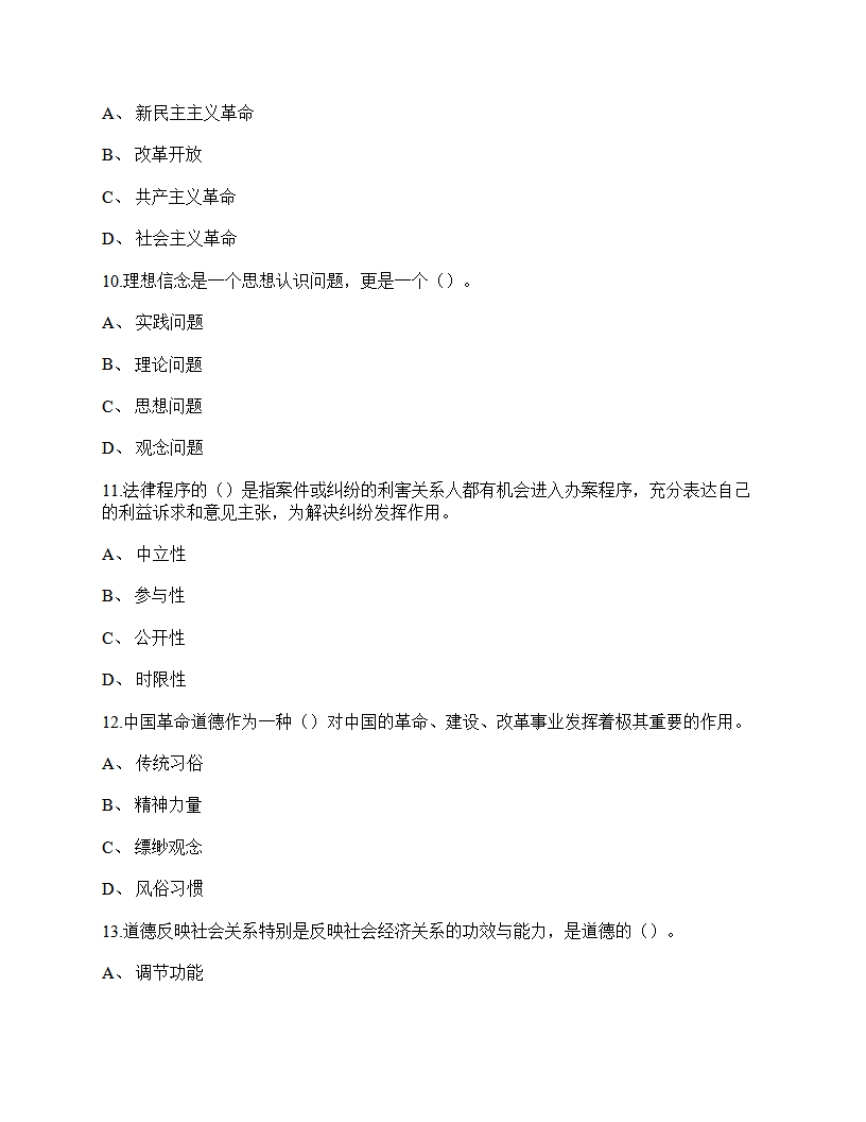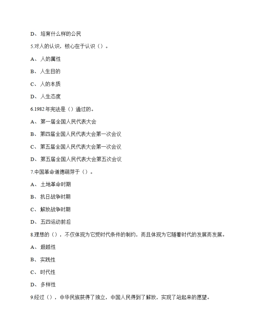 华中料技大学《思想道德与法治》2022-2023年第学期期未试卷一、单项选择题1树立正确的人生观,思考人生为了什么、该如何对待人生、怎样的人生才有意义等问题,离不开()科学世界观的指导。A、实用主义B、马克思主义C、功利主义D、资本主义2.()是指人们通过生活实践形成的对人生问题的一种相对稳定的心理倾向和精神状态。A、人生态度B、人生目的C、人生价值D、人生理想3.()的思想以其科学而高尚的品质,代表了人类社会迄今最先进的人生追求。A、为小群体服务B、服务人民、奉献社会C、为少数统治者服务D、为个人和家庭服务4.自由、平等、公正、法治这一价值追求,回答的是我们要()的重大问题。A、建设什么样的国家B、建设什么样的社会C、构建什么样的世界