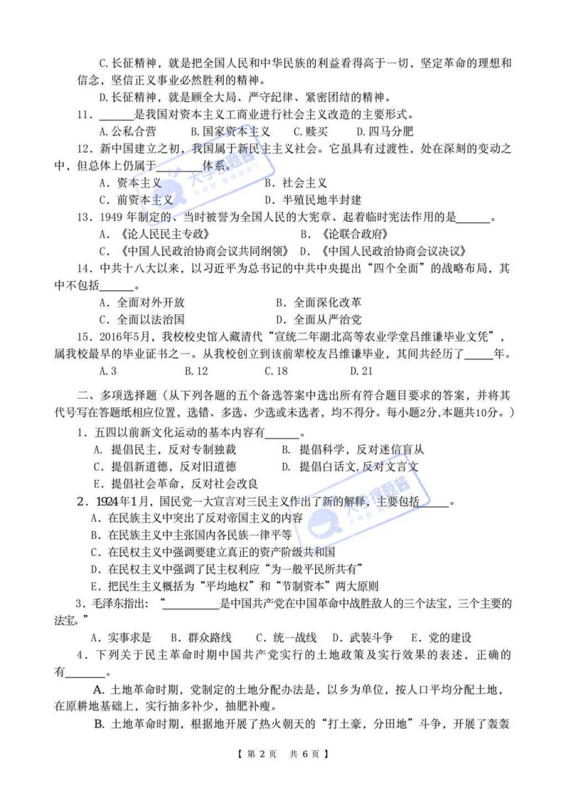 华中农业大学本科课程考试试卷考试课程与试卷类型:中国近现代史纲要A姓名:学年学期:2019-2020-01学号:考试时间:2020-01-29班级:一、单项选择题(从下列各题的四个备选答案中选出一个最符合题目要求的正确答案,并将其代号写在答题纸相应位置处,选错、多选或未选者,均不得分。每小题1分,本题共15分。)1.认识近代中国一切社会问题和革命问题的最基本的依据是A.中国近代社会近代化的历史进程、。B.中国近代民族民主革命的性质C.中国近代社会半殖民地半封建的性质、D.中国近代救亡与启蒙的时代主题2.郑观应在中主张大力发展民族工商业,提出“习兵战不如习商战”的思想。A.《海国图志》B.《四洲志》C.《瀛寰志略》D.《盛世危言》3.创办了我校前身-一湖北农务学堂的是,他创办的最著名的民用企业是A.曾国藩…江南制造总局B.张之洞…轮船招商局C.张之洞…汉阳铁D.曾国藩…汉阳铁厂4.下列关于清末新政的叙述,不正确的是A.正式废除了科举考试B.宣布预备仿行宪政,颁布《钦定宪法大纲》C.成立了责任内阁D.在一定程度缓和了社会危机5.下列关于中国近代民族资产阶级的叙述,正确的是A.是带有两重性的阶级B.依附于帝国主义和封建主义C.孔祥熙是民族资产阶级的代表D.由于残酷剥削工人而成为民主革命的对象6.1919年五四运动的爆发的直接导火索是A.巴黎和会上中国外交的失败B.华盛顿会议侵犯中国主权C.北洋政府与日本签订“二十一条”D.思想文化上的尊孔复古逆流7.大革命后期,中国共产党中央领导机关犯了错误。A.右倾机会主义B.“左”倾盲动错误C.“左”倾冒险主义D.“左”倾教条主义8.下列关于西安事变的叙述,不正确的事A.西安事变是张学良、杨虎城为了实现停止内战、逼蒋抗日而发动的。B.中国共产党促成了西安事变的和平解决。C.西安事变的和平解决成为时局转换的枢纽。D.西安事变和平解决后,国共内战并没有真正结束,而是时打时停,断断续续。9.中国抗战时期,美国陆军航空队退役军官组建美国援华志愿航空队(即“飞虎队”)来参加对日作战,支援中国人民的抗日事业。A.司徒雷登B.赫尔利C.陈纳德D.史迪威10.下列关于长征精神的叙述,不正确的是A.长征精神,就是为了救国救民,不怕任何艰难险阻,不惜付出一切牺牲的精神。B.长征精神,就是天下兴亡,匹夫有责,不惜一切挽救民族危亡的爱国精神。【第1页共6页】