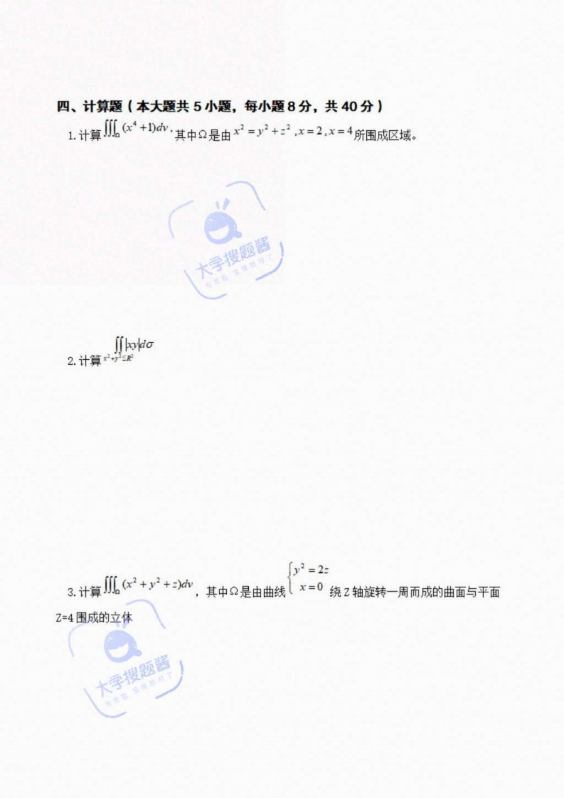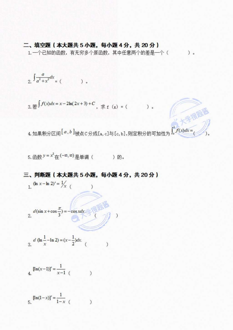 江苏大学2021-2022学年第一学期期末考试《高等数学A1》期末试卷A题目三四总分器分数20202040100得分一、单项选择题(本大题共5小题,每小题4分,共20分)lim(sin1.极限的未定式类型是(A.00型B.0/0型C.10o型D.oo0型x'sin Ilim2.极限”sinx=()A.0B.1C.2D.不存在3.日x0时,n阶泰勒公式的余项m(x)是较x日x0的()A.(n+1)阶无穷小B.n阶无穷小C.同阶无穷小D.高阶无穷小4.若函数(x)在[0,+oo]内可导,且f(x)>0,xf(0)<0则(x)在[0,+o]内有()A.唯一的零点B.至少存在有一个零点C.没有零点D.不能确定有无零点5.曲线y=x2-4x+3的顶点处的曲率为(A.2B.1/2C.1D.0