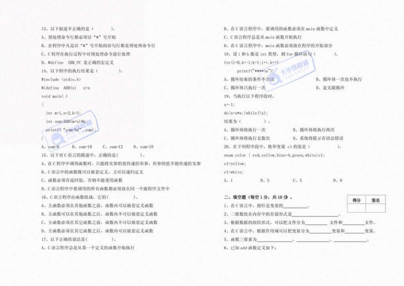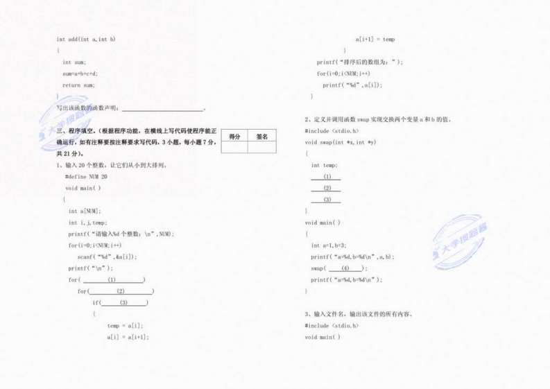 ⊙6,已知函数fread的调川形式为fread(buffer,ie,count,fp).其中buffer井冈山大学《C语言程序设计》2022-2023学年第二学期期末试卷代表的是(课程名称C语直程序设计考试时量100分钟A,存放读入数据项的存储区B、存放读取数据的地址或街向北地址的指甘分人C、一个指向所读文件的文件指计签名D、一个整形变量,代表要读入的数据项总数标准分数127,合法的数组定义是(调实得分数A、int al】e“string”:B.1ntn5]-0.1,2345副:C、hsts=“string”:D.char a[1=0,l,2,3,4.51:一单选愿(每一小题的备选答案中,只有一个养案是正确的。得分签名8、C请言表达式5>2>7》8的值是(请把你认为正确答案的选项填入表格内。错透、多选、不选均A,22B,2c,1D.0不给分,20小愿。每小愿2分,共40分)。9、若有语句:doub1ep[6】:其含义是1、在C调言中,介法的学符常量是A、p是指向ouble型变量的指针B,p是double程数铜A.·1084D.”10"C、p是指向doub1。类型的指针数组D。D是数如指针2,在下列这项中,不正确的以的语句是(10,函数说明语句:oid *fun():的☆义是(A、B.n1=(n2=(n3-0)jA,函数m的返国值是一个通用型指针C.keimj:D、b+eB、函数n的逐回值可以是任意类型3。在C近言中,静态变量存储类型的说明符是(C,函数fun无返国值A、autoB、registerC.statieD.externD、指计an指向一个函数,谈函数无返回值4、设有如下定义:intx=10,y3,z:则语句printf(dn”,2=(xy,x/y):的输由11、有语句:char[20=”programing”,pss;则不能用字每o的表达式是结果为((A.1B.0C.4D.3A.ps+2B.s[2]C.ps[2]D、m=2,ps五。当定义一个结构体变量时系饶分配拾它的内存空例大小是(12.下列说法不正确的是(A。各个成员所需内存的总和A,主函数用中定义的变量在整个文件或程序中有效©B,结构体中第一个成员所需的内存星B、不同函数中,可以使用相同名字的变餐C、各个成员中占用内存量最大者所需的靠量C、形式参数是局部变量D。结构体中最后一个成员所雷的内存量D、在一个函数内能,可以在复合语句中定义变量。这华变量只在本复合语句中有效据