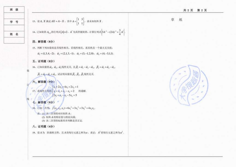 班级共2页第1页4、若方程组2+马1=0学号存在基础解系。则无=()井冈山大学线性代数B试题4无+斯=0(2021/2022学年第一学期)4:(B):C1:D)任意实数姓名三四五六七八总分5、设A为正交如阵,A=-1.则其作随矩阵A=()A-A':(B)A':(O-A:(D)A.二,填空题(每空3分,共15分)一、单选题(每题3分共15分》2-11-102、行列式220中2项的系数为1。设行列式D■24,侧与D有不值的行式为《)5-2027、设方A满足等式A3一A-3E=0.别(A+E)=Am2+e-14+2:8.设向量组么=1.21),a=(亿3),元,=(2a,3)线性相关.则a=50-2502019、着a=L,2,31),a1=(2,34,3)为博元李齐次线性方程组AX=b的两个解,且CD4-124)=3,则对应的齐次线性方程组AX一0的通解为5-210.已知实数A是方库A的特征值。期矩阵A2有一个特征值2,设A.B均为:阶方阵,则下列各项中正确的是()(A)(AB)=AB:(B)AB=BA:三、计算题(每题8分,共32分)(C)(AB)BA-:(D)A:-B=(A+BX(A-B).2003.下列命题中不正确的是()11、设A=023.B=。「1-2-3]计算2A+BB(A)若向量组瓦,石.高,线性无关,则向量组在,G提性无关0122-10(B若向量组运,a线性无关。a,a,线性无关,则么,么一定线性无关2-52130(C:+1个n推向量一定线性相关:12.计算行列式D0310(D)若向量组元.远.忘,线性相关,则元不一定可以由云.瓜,线性表示3-911