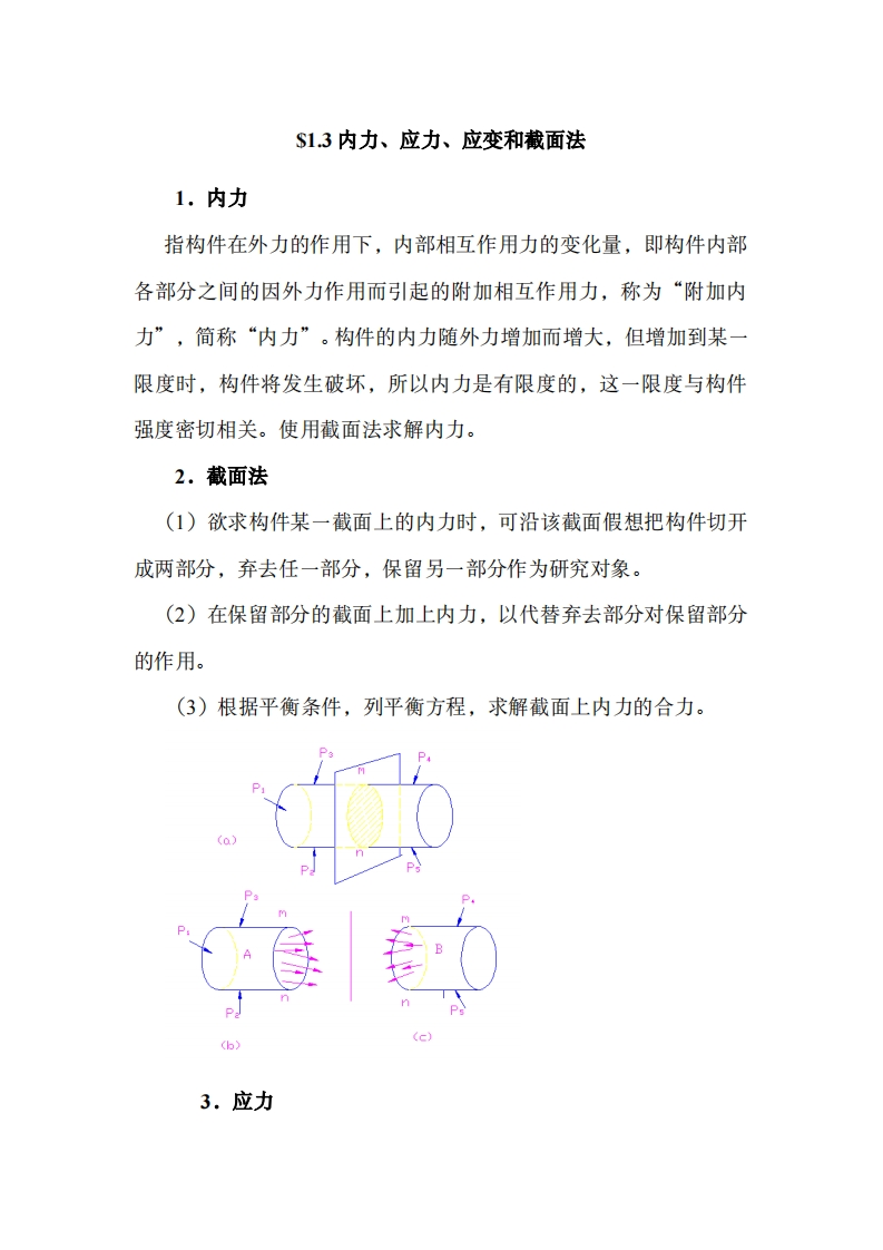 第一章绪论S1.1材料力学的任务1.材料力学的任务在满足强度、刚度、稳定性的要求下,为设计既经济又安全的杆件,提供必要的理论基础和计算方法。2,强度、刚度、稳定性的概念强度是指构件在载荷作用下抵抗破坏的能力。刚度是指构件在载荷作用下抵抗变形的能力。稳定性是指构件在载荷作用下保持原有平衡形态的能力。S1.2材料力学的基本假设1.连续性假设物体的结构是密实、无空隙的,因而其力学性能是连续的。2.均匀性假设物体内各点材料均匀分布,其力学性能是均匀一致的。3.各向同性假设物体内任一点处沿各个方向的力学性能都相同。4.小变形假设材料力学研究的问题,仅限于变形的大小远小于构件的原始尺寸的情况。在小变形条件下,研究构件的平衡和运动时,可以忽略构件的变形,而按构件变形前的原始尺寸进行分析计算。