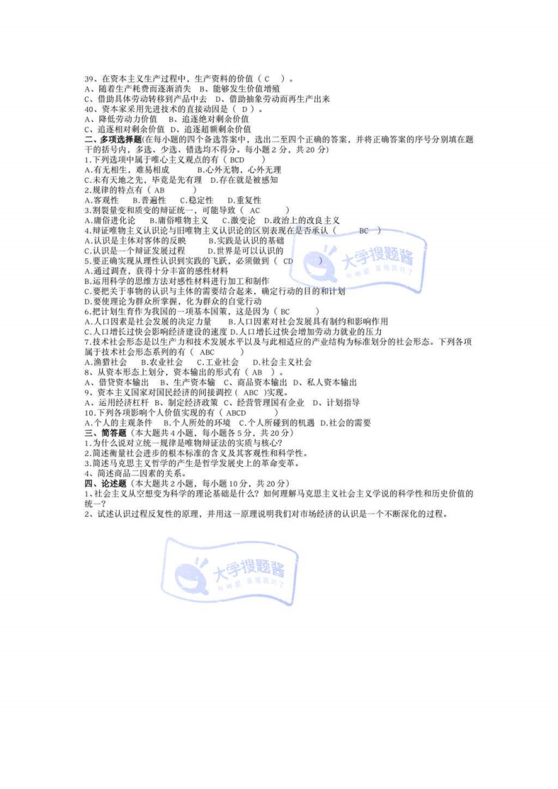 兰州大学《马克思主义基本原理概论》2020-2021年第二学期期末试卷一、单项选择题(本大题共40小题,第小题1分,共40分)在第小题列出的选项中只有个选项是符合题目要求的,请将正确选项前的字母填在题后的括号内。1.对哲学基本问题第二个方面内容的不同回答是划分(CA.唯物主义和唯心主义的标准B.辩证法和形而上学的标准C.可知论和不可知论的标准D.辩证唯物主义和形而上学唯物主义的标准2.马克思主义哲学最显著的特征是(CA.客观性B.辩证性C.实践性D.系统性3.中国宋代哲学家朱熹提出“理在事先”。这种观点属于(B)A.主观唯心主义B.客观唯心主义C.形而上学唯物主义D,辩证唯物主义4.实现意识能动性的根本途径是(AA.投身社会实践B.认识客观规律C,加强主观努力D,制订周密计划5.哲学上的一元论认为,世界上的一切事物和现象有(C)A.共同的发展规律B.共同的发展过程C,共同的本原D,共同的形式6.意识是人脑的机能,是说(DA.意识是人脑自生的B.意识是人脑的分泌物C,人脑是意识的源泉D,人脑是意识的物质器官7.世界统一于物质的观点属于(A)A,唯物主义观点B.辩证法观点C,形而上学观点D,宿命论观点8.1958年,我们认为麻雀吃粮食,于是把它列为“四害”之一,加以消灭。后来,我们认识到麻雀在消灭害虫方面贡献很大,便把它从“四害”中解放出来,并列为保护动物。1958年。我们消灭麻雀的错误。从哲学上看是没有做到(B)A.用全面的观点看问题B.用发展的观点看问题C.用实践的观点看问题D.用量变质变的观点看问题9.在唯物辩证法看来,房子同平房、楼房、别墅等的关系属于(B)A.整体和部分的关系B.共性和个性的关系C,本质和现象的关系D.内容和形式的关系10.中共十六大报告慨充分肯定了十三届四中全会以来取得的举世瞩目的伟大成就,又实事求是地指出了存在的困难和问题,认为前者是主流,后者是支流。这是用(DA.事物发展的内因和外因相统一的原理看间题B.矛盾的同一性和斗争性相统一的原理看问题C.矛盾的普遍性和特殊性相统一的原理看问题D。“两点论”和“重点论”相统一的原理看问题11.社会经济的发展引起教育事业的发展,而教育事业的发展大大提高了劳动者的素质,反过来进一步推动经济增长。从因果关系来看,这属于(A.原因和结果的相互区别B.原因和结果的相互依存C.原因和结果的相互融合D.原因和结果的相互作用12.真象和假象的区别在于(DA.真象是客观的,假象是主观的出所B:其象表现本质:假象不表现本质发达C.真象是相对稳定的.假象是活跃易变的D.直象从正面直接地表现本质,假象从反面歪曲地表现本质13.在中国,为了治疗疾病,古代就产生了中医学。这说明(A)A.认识产生于实践的需要B.认识是实践的目的C.实践是检验认识的标准D.实践是认识的本质14.概念,判断、推理是(C)A.社会心理的三种形式B.社会意识形态的三种形式C.理性认识的三种形式D.感性认识的三种形式15.有人认为只有写到书本上的理论才是真实可靠的,便不顾实际情况,生搬硬套书本上的理论。这犯了(c)A.唯心主义先验论的错误B.直观被动反映论的错误C.教条主义的错误D.经验主义的错误16,要判断一种观点的是非对错,下列说法中正确的是(D)A.以伟人之是非为是非B.以吾心之是非为是非C,以众人的意见定是非D.以是否在实践中得到证明定是非17.人类区别于动物的根本标志是(C)A,具有思维能力B.具有语言文字