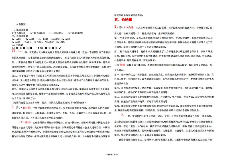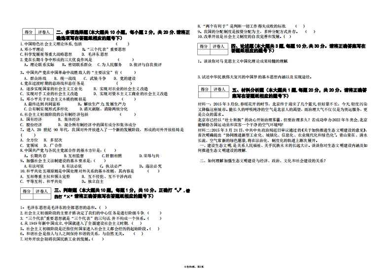 兰州大学2020-2021学年度第二学期毛泽东愿塑和中国特色壮女主义理论体系藏论》课在期末考试卷A、改革与开放的关系B、发展与稳定的关系C、计划与市场的关系D、速度与效益的关系话用专业:A卷10在我国经济发展过程中,气可以发挥市场经济的优势,又可以发挥杜会主文制度的优越性,在往意事项:、请在试在的密封处填写系第。专业班坝、姓名和学号处一理市场机制和宏观调控、当前发展和长远发展、效率和公平等关系方面,能够比西方国家做得2.考试时其四-分钟.更好和更有成效。这是因为(3。蜂命袁考题答案位翼不够,可国在所附韵白报上:A我国既坚特公有制的主体地位,又允许和鼓助多种所有制经济共同发展4演草情使用所提供韵专用白银不准使用自备银张且我国既整持按劳分配灼主体地位又允许和鼓助多种分配方式并存5、铝战内不准答题.C。我国的市场经济体制是同杜会主文基本制度结合在一起的二三马五单分合分人D我国的政革开敏是间四项基本原则结合在一起的得分11。提出全面建设小康杜会是(A。中共十四大B。中共十五大C。中共十六大D。中共十七大2张某应聘到一个多镇企业担任厂长,按合同规定,除工赏外,他每年还可以从企业利铜中提取得分评卷人5%的很例。今年他获得3万元提成,这3万元属于()一、单项选择夏(本大■共20小厘海小夏1分,共20分.请将正确A联产计啊收入B。赏金分红收入C经营风验收入D按劳分配收入透项写在答题低相应的题号下)3.我国的根本玫治制度是1、马克思主文与中国实际相结合的第一次历史性飞跃产生的理论成果是()A.人民民主专政B.人民代表大会制度A、毛泽东思想B、新民主主文理论C、新三民主文D、幕小平理论C.民族区域自治制度D.共产党领导的多党合作和政治协商制度2区别旧民主主文革命与新民主主文革命的根本标志是《)14。发展杜会主文民主政治,最根本的是要(》A。革命的折导思想不同B。革命的领导阶级不同C。革命的前途不间D。革命的对象不A坚特党的领导人民当家作主和依法治国的有机统一B。实现民主政治的制度化、线范化同C充分发挥人民群众的监督作用D。有领导、有步骤地推进玫治体制改飞邓小平理论中,关于建设中国特色杜会主文首先要搞清楚的首要基本理论间题是《革A。解放思想实事求是品杜会主文初饭阶段15。毛泽东提出的繁球我国科学文化事业的方针是C是姓“赏”还是姓“杜”的判断标准D。什么是杜会主义、怎样建设杜会主文A、团结一批评一团结B、大鸟大放4.我们今天诗一切从中国的实际出发,其中最大的实际就是《C、百花齐放,百家争鸟D、发展民族的、料学的、大众的文化A.人▣多,底子薄R地区发展不平衡16。杜会主文核心价值体系的主题是C.正处于并将长期处于杜会主文初极喻段D.农业人口仍占很大比重A.马克思主义的指导思想B.中国特色杜会主文的共同理想5.觉在过镶时期总路线的主体是(c.民族精种和时代精种D.杜会主文菜辱观A.对农业的杜会主文改造B.对手工业的杜会主文改造7.觉无杜会更加和谐列为全面建设小康杜会的一个重要目标明确提出是()C.对赏本主文工商业的杜会主文改造D.实现杜会主文工业化A觉的十五大且党的十六属四中全会6.“一个中心,两个基本点”是对杜会主文初级阶段基本路线的简明概括.“一个中心”是折(C。觉的十六大D。觉的十六属六中全会A.以经济建浪为中心B.以构建和谐杜会为中心1&党领导人民治理国家的基本方略是(C.以政革开放为中心D.以坚特以人为本为中CA依权治国B。依计划治国C依法治国D依方针政策治国7。我国杜会主义建设的战略目标是()19。当今时代的主题是(A、实现农业、工业、国防和科学技术现代化B、实现工业化、杜会化、市场化、和现代化A.和平与发展B.和平、发展、合作C.战争与和平D.发展与进步C、实现政治、经济和文化的现代化D、把我国建设成为富强、民主、文明的杜会主文现代化国家20实行“一国两制的前提是(8。那小平历来十分重税农业间逆。他强调指出:“发业是根本,不要忘游”.“农业搞不好,工业就A。坚持一个国家、两个玫府没有希望,吃、穿、用的问题也解决不了。”他告诚我们:“90年代经济如果出问遵,很可能出在C。整并一个中国即中华人民共和国B。坚特会有制物拔劳分配D坚开四项基本原愿农业上:如果发业出了问题,多少年缓不过来整个经济和社会发展的全局都要受到严重影响“.这些话的意思是,发业()A是我国国民经济中的第一产业且在国民经济中处于基地位C。对国民经济的发展起主导作用D。是经济现代化的重要标忠9。确定我国经济体制政革日标的核心间题是正确认讯和处理()本香度.第1真