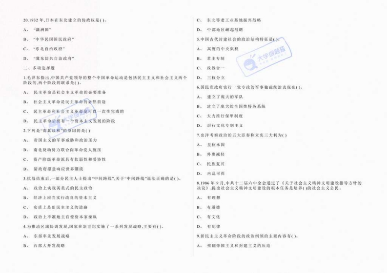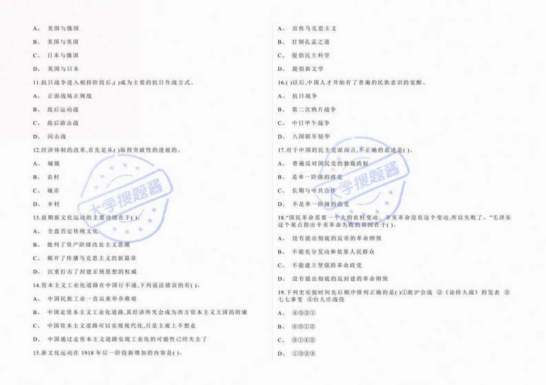 洛阳简范学院《中国近现代史锅要》2022-2023年第一学期期米试题且。邓小平思想一,单项感择题C,邓小平学说1.149年中华人民共和国的诞生.标志着()革命阶段的开始。D、中国特色社会主义理论A,民主主文6.下列不属于毛泽东在土地革命战争时期的著作的是()B,社会主义A。《湖南表民运动考察报告》C,斯民主主义B,《反对本本主义)D、旧民主主义C、《井网山的年争)大学搜题2中国抗日战争取得胜利的决定性因素是():D、《中国的红色政权为什么能够存在》A,其产党的中流延柱作用7.南亲国民政府成时的路都是():B、以爱国主文为核心的民疾精神A,武汉C、全民戴的共同抗战B、广州D,国际社会爱好和平国家和人民的支精C,贵阳3.下列不属于洋务运动的内容是()D、重庆A,创办近代军事和民用工业8.《其同州领》最基本。最核心的内容是()B。建成无洋。南洋和辐建三支海军A,关于国体和攻体的凝定C、举办新式学堂B。关于经济方针的规定D、废除科举C,美于民族政策的缓定4,帝国主义列强获得在中国领士驻兵的特权是通过():D、关于外交政策的规定A,《南京条的】9.在中国制造旅顺大曙桑的侵略者是()。B。《北京条约)大伊搜题图A。日本C,《马关条约》B,俄国D.《辛丑条的】C,英国5.中共十五大把()同马克思列宁主义,毛泽东思塑一起作为党的着导思如写入党D、德国得+10.1904年至1905年,为了争等在华利丝而在中国东北进行战争的帝国主义国家是A。邓小平理论