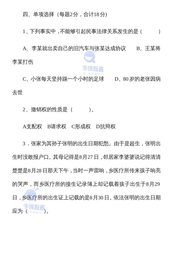 《民法总论》习题一一、名词解释(每题5分,合计20分)》1、民事法律关系2、代理3、肖像权4、民事责任5、合伙三、判断(每题1分,合计5分)1、“民法”一词,来源于古罗马的万民法。()2、人民法院的判决或裁定能够引起一定的民事法律后果,因而也是法律事实。()3、公民的民事权利是可以放弃、转让的,因此,公民的民事权利能力也是可以放弃的、转让的。()4、企业法人分立和合并,它的权利和义务由变更后的法人有和承担。()5、依照双方的约定必须由本人亲自实施的民事行为,本人未亲自实施的,应当认定该行为无效。()学搜题酱超三接联习