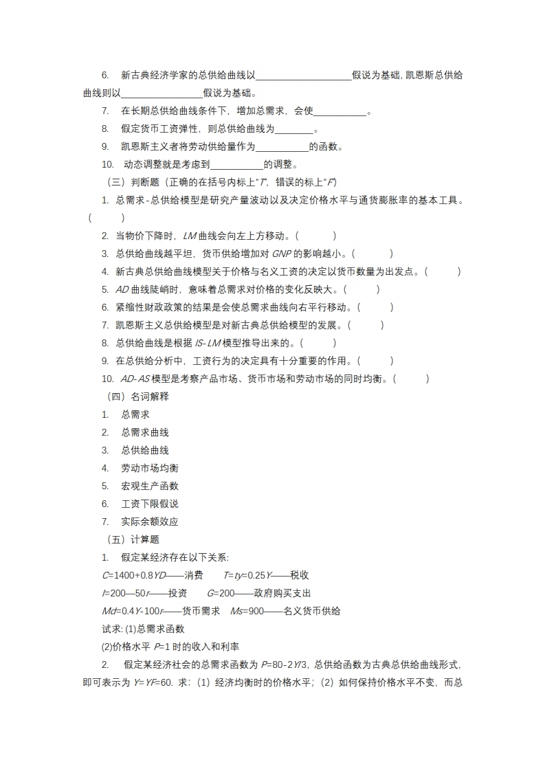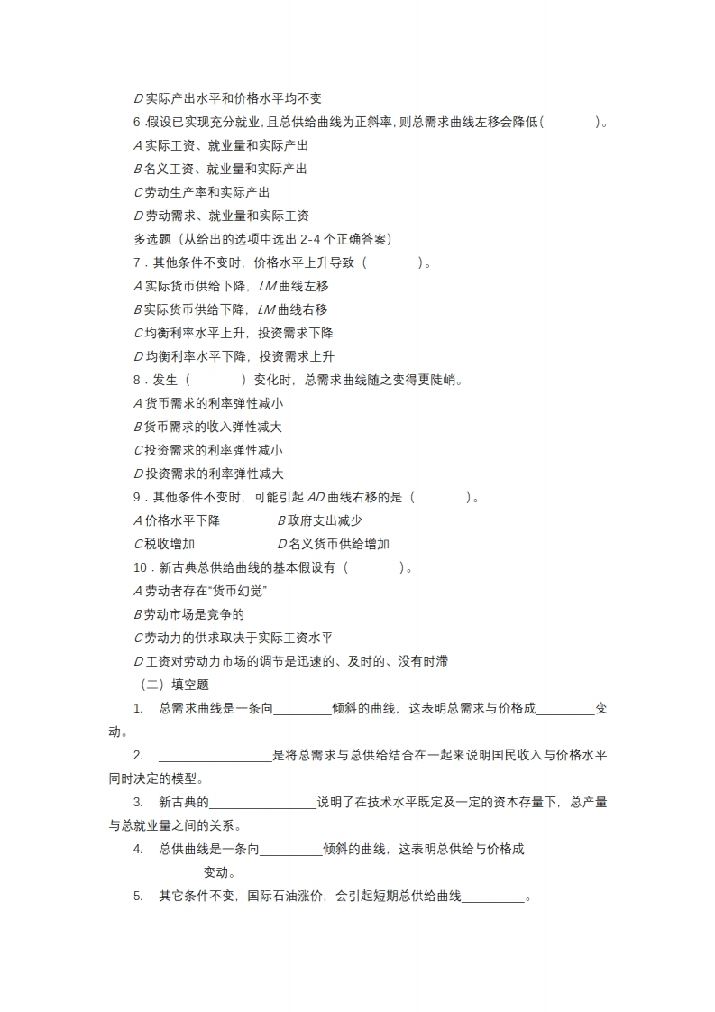 南京大学2022一2023学年第一学期期末考试《宏观经济学》注意:1、请考生仔细检查试卷,如有错、漏、破烂现象请及时报告监考老师更换。2、请将答案填写到答题卡指定位置,试卷答题无效。3、请考生勾选考生诚信考试承诺。4、考试时间:120分钟。(一)选择题单选题1.价格水平上升导致(A实际货币供给下降,LM曲线左移B实际货币供给下降,LM曲线右移C实际货币供给上升,LM曲线左移D实际货币供给上升,LM曲线右移2.总需求曲线向右下方倾斜的原因在于()。A国外需求与价格水平呈反方向变动的趋势B消费需求与价格水平呈反方向变动的趋势C投资需求与价格水平呈反方向变动的趋势D以上几个因素都存在3,其他条件不变时,()因素引起AD曲线左移。A价格水平下降B政府支出减少1C税收减少D名义货币供给增加4,下列说法中,正确的是()A一般而言,在生产函数中所有投入要素的数量均可变动B在有关总需求和总供给的研究中,常使用资本量不变的总量生产函数C充分就业量即所有劳动力都得到工作时的总就业量D在有关总需求和总供给的研究中,常使用就业量不变的总量生产函数5,假设已实现充分就业,且总供给曲线为一垂线,则税收减少会导致()。A实际产出水平和价格水平上升B价格水平上升,而实际产出不变C实际产出上升,而价格水平不变