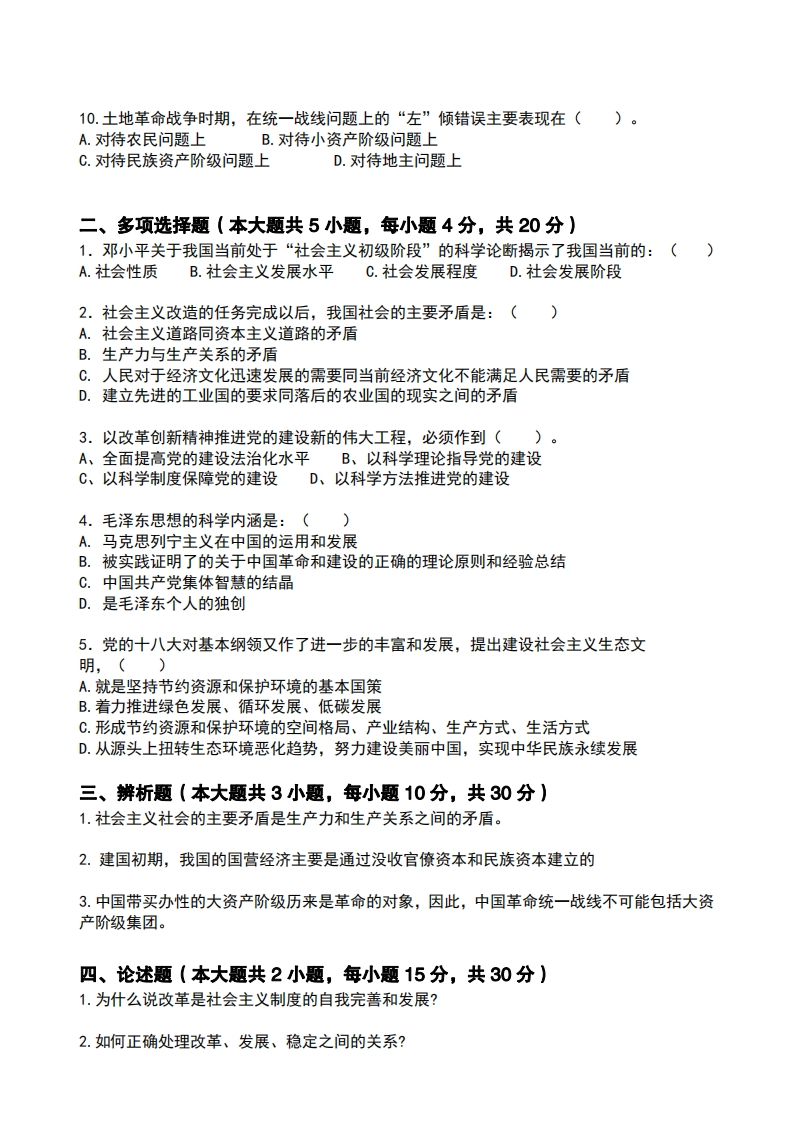 南京理工大学2019一2020学年第二学期期末试卷《毛泽东思想和中国特色社会主义理论体系概论》(A)卷题目三四总分分数20203030100得分一、单项选择题(本大题共10小题,每小题2分,共20分)1.中国革命阵营实现壮大自己、孤立和瓦解敌人而采取的政策是()。A.加强地方政权建设B.实行军队内部民主C.建立革命统一战线D.采用正确的战略战术2.我国第一个五年计划时期是()。A.1951-1955B.1952-19560.1953-1957D.1954-19583.我们建设的小康社会,是全民族的思想道德素质、科学文化素质和健康素质明显提高的社会,届时将形成比较完善的现代国民教育体系、()创新体系、全民健身和医疗卫生体系。A.科技和军事B.科技和文化C.军事和文化D.教育和科学4.近代中国沦为半殖民地半封建社会的最根本原因是()。A.封建统治阶级的腐败B.民族资产阶级的软弱C.大地主大资产阶级的卖国D.帝国主义的侵略5.人民民主专政的组织形式是()。A.工农联盟B.人民代表大会C.参事制D.民主协商6.科学发展观的核心和本质要求是()。A.坚持以人为本B.实现共同富裕C.发展社会生产力D.坚持公有制为主体7分“三步走”基本实现现代化的发展战略,到20世纪末()。A.国民生产总值比1980年翻两番B.国民生产总值比1980年翻三番C.人均国民生产总值比1980年翻两番D.人均国民生产总值达到中等发达国家水平8.我国最晚设立的自治区是()。A.新疆维吾尔自治区B.广西壮族自治区C.宁夏回族自治区D.西藏自治区9.我国农业合作化采取的第一个步骤是()。A.互助组B.初级农业生产合作社C.高级农业生产合作社D.人民公社