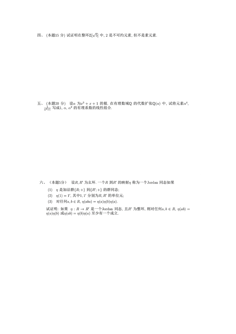 南开大学2021-2022学年第二学期数学学院《抽象代数》期末试卷专业:年级:学号:姓名:题目三四五六卷面成绩得分一、(本题30分)解答下列问题:1.试叙述群的正规子群的概念,并举出一个群的非正规子群的例子2.试叙述循环群的概念,并详细叙述阶数最小的交换而非循环的群的结构(写出乘法表)3.试叙述环的理想的概念,并举出一个环的子环但非理想的例子.4.试叙述域的有限扩张和代数扩张的概念,并举出一个域的代数扩张但不是有限扩张的例子,二、(本题15分)设G为群,且G只有{c}和G两个子群,其中e为单位元.试证明G={}或G为素数阶循环群.三、(本题15分)设R为整环,U为R的单位群,I为R的理想,令U={a∈Ula-1∈I},其中1为R的单位元.试证明U,为U的子群.