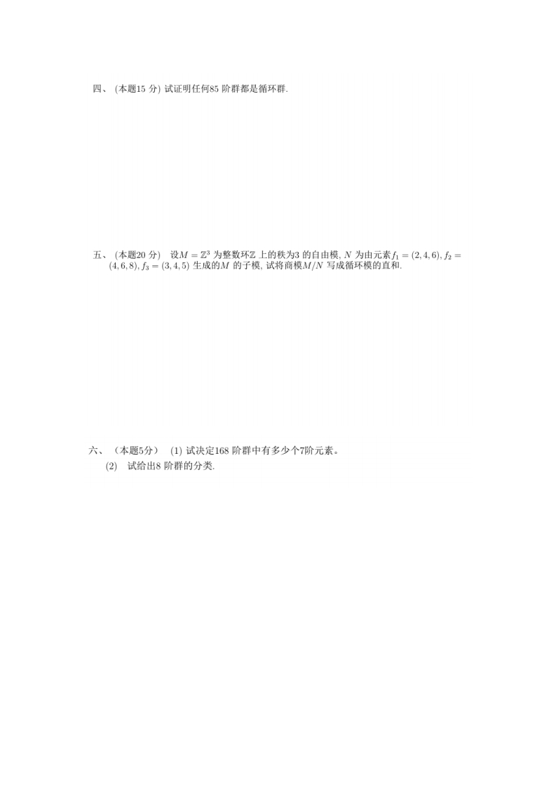南开大学2022-2023学年第二学期数学学院《抽象代数》期末试卷专业:年级:学号:姓名:题目四五六卷面成绩得分一、(本题20分)解答下列问题:1.试叙述群的Sylow子群的概念,并找出S4的所有Sylow2-子群2.试叙述单群的概念,并写出阶数最小的非交换的单群3.试叙述交换么环上自由模的定义,并举出一个整数环上非自由模的例子4.试叙述交换么环上的扭模的定义,并叙述主理想整环上有限生成模的结构定理,二、(本题15分)设印,q为素数,试证明任何pq阶群都不是单群三、(本题20分)设R为交换么环,M,N为两个模,∫:M→N,g:N→M为模同态,且fg()=,yeN,试证明:M=kerf⊕img.