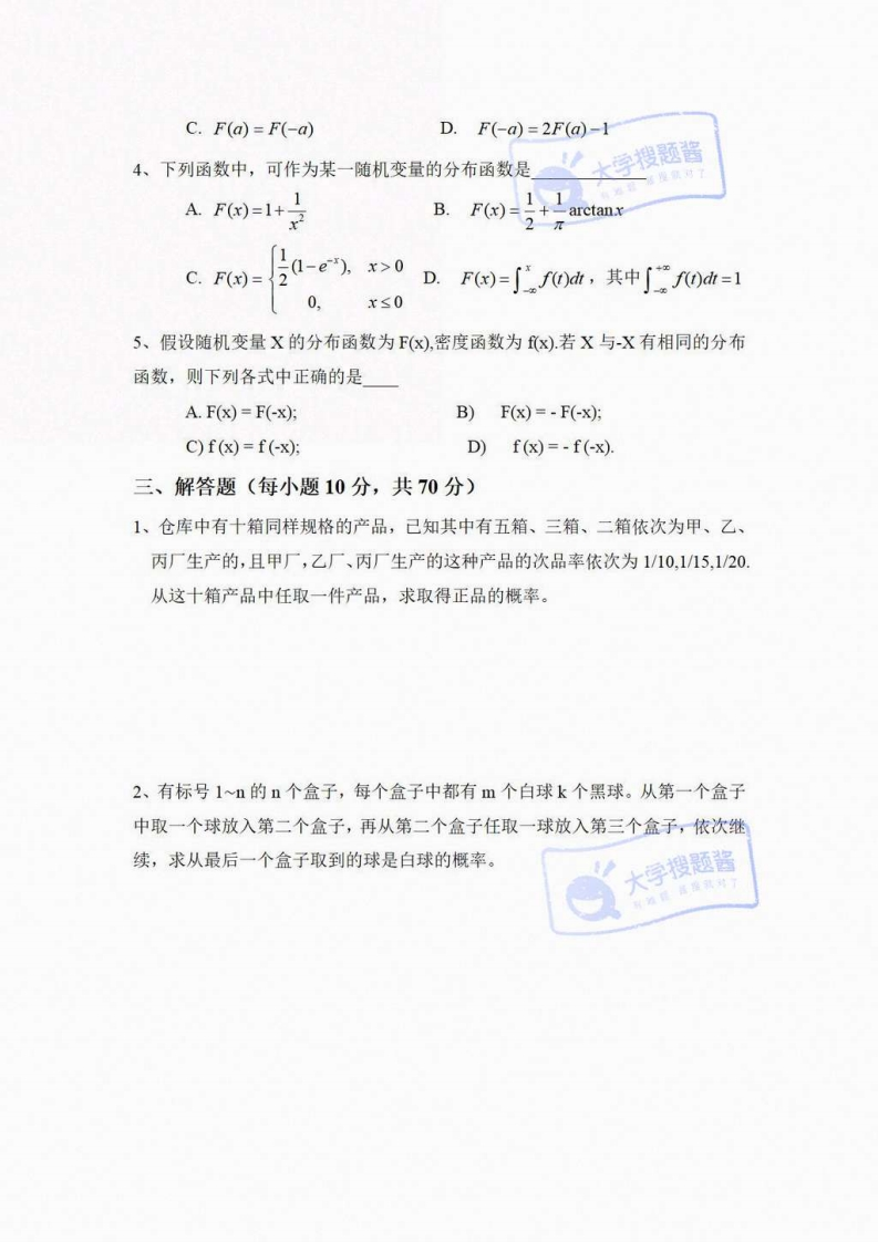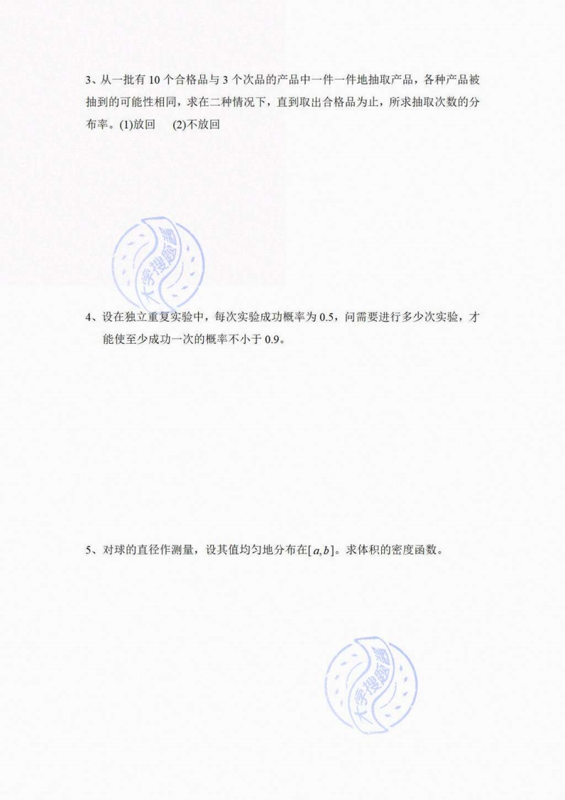 齐鲁工业大学《概率论与数理统计》2022-2023学年第一学期期末试卷_5369499猴哥6个月前更新关注私信0.30MB4页08544齐鲁工业大学《概率论与数理统计》2022-2023学年第一学期期末试卷_5369499此内容为付费资源,请付费后查看10积分年度会员免费月享会员免费登录购买付费资源已售 105 第1页 / 共4页 第2页 / 共4页 第3页 / 共4页 试读已结束,还剩1页,您可下载完整版后进行离线阅读 © 版权声明文章版权归作者所有,未经允许请勿转载。THE END《齐鲁工业大学》期中期末历年真题期末试卷 文本预览 齐鲁工业大学2022-2023学年第一学期《概率论与数理统计》期末考试试卷(A卷)满分:100分考试时间:120分钟学院:专业:姓名:考号:题号二三总分得分注意事项:1、严守考试纪律,请勿作弊2、注意考试时间,合理安排做题速度一、填空题(每小题3分,共15分)1、用(X,Y)的联合分布函数F(xy)表示P{a≤X≤b,Y 查看更多 收起部分 喜欢就支持一下吧点赞44赞赏 分享QQ空间微博QQ好友海报分享复制链接收藏 猴哥关注 04.7W+0281261W+ 北京理工大学-睿信书院-《复变函数与积分变换》2018-2019学年期末试卷B卷北京理工大学-睿信书院-《复变函数与积分变换》2018-2019学年期末试...6个月前 2.3W+北京理工大学《计算机基础》2018-2019学年期末试卷北京理工大学《计算机基础》2018-2019学年期末试卷6个月前 2.3W+北京理工大学《高等数学》2019-2020学年期末试卷北京理工大学《高等数学》2019-2020学年期末试卷6个月前 2.3W+北京理工大学数据结构期末试卷北京理工大学数据结构期末试卷6个月前 2.3W+北京理工大学《计算机基础》2017-2018学年期末试卷北京理工大学《计算机基础》2017-2018学年期末试卷6个月前 2.3W+北京理工大学-睿信书院-《复变函数与积分变换》2016-2017学年期末试卷A卷北京理工大学-睿信书院-《复变函数与积分变换》2016-2017学年期末试...6个月前 2.3W+ 上一篇 普通心理学复习考试题_5030847 下一篇 齐鲁工业大学《高等数学》2020-2021学年第二学期期末试卷_5273336 相关推荐 北京理工大学-睿信书院-《复变函数与积分变换》2018-2019学年期末试卷B卷北京理工大学-睿信书院-《复变函数与积分变换》2018-2019学年期末试卷B卷6个月前 2.3W+北京理工大学《计算机基础》2018-2019学年期末试卷北京理工大学《计算机基础》2018-2019学年期末试卷6个月前 2.3W+北京理工大学《高等数学》2019-2020学年期末试卷北京理工大学《高等数学》2019-2020学年期末试卷6个月前 2.3W+北京理工大学数据结构期末试卷北京理工大学数据结构期末试卷6个月前 2.3W+北京理工大学《计算机基础》2017-2018学年期末试卷北京理工大学《计算机基础》2017-2018学年期末试卷6个月前 2.3W+北京理工大学-睿信书院-《复变函数与积分变换》2016-2017学年期末试卷A卷北京理工大学-睿信书院-《复变函数与积分变换》2016-2017学年期末试卷A卷6个月前 2.3W+ 评论 抢沙发 请登录后发表评论 登录 注册 暂无评论内容