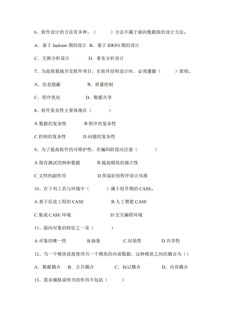 青海大学计算机课程期末试卷(2017-2018学年第一学期)考试形式:闭卷考试对象:考生姓名:考生学号:题号二三四总分分值一、单选题(在每小题的四个备选答案中,选出一个正确答案,并将正确答案的序号填在括号内。每小题2分,共40分)1、“软件危机”是指(A.计算机病毒的出现B.利用计算机进行经济犯罪活动C.软件开发和维护中出现的一系列问题D.人们过分迷恋计算机系统2、具有风险分析的软件生存周期模型是()A.瀑布模型B.喷泉模型C.螺旋模型D.增量模型3、下列有关软件工程的标准,属于行业标准的是()A.GBB.DINC.ISOD.IEEE4、DFD中的每个加工至少需要(A.一个输入流B.一个输出流C.一个输入或输出流D.一个输入流和一个输出流5、为了提高模块的独立性,模块之间最好是(A.控制耦合B.公共耦合C.内容耦合D.数据耦合