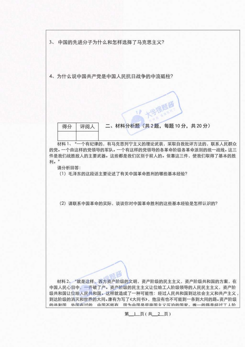 大搜题酱华中师范大学2019-2020学年第一学期期末考试试卷(A卷)课程名称中国近现代史纲要课程编号34000022任课教师题型简答题材料分析题论述题总分统分人3郑分值402040100得分得分评阅人一、简答题(共4题,每题10分,共40分)》杯1、近代中国的社会性质、基本特点和主要矛盾是什么?2、怎样理解辛亥革命是一次比较完全意义上的资产阶级民主革命?翻3、以毛泽东为主要代表的中国共产党人是如何探索和开辟中国革命新道路的?4、为什么说中国共产党是中国人民抗日战争的中流砥柱?5、抗日战争胜利后,国民党政府为什么会陷于全民的包围中并迅速走向崩溃?