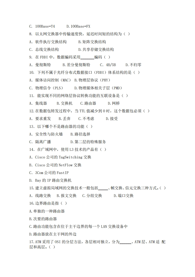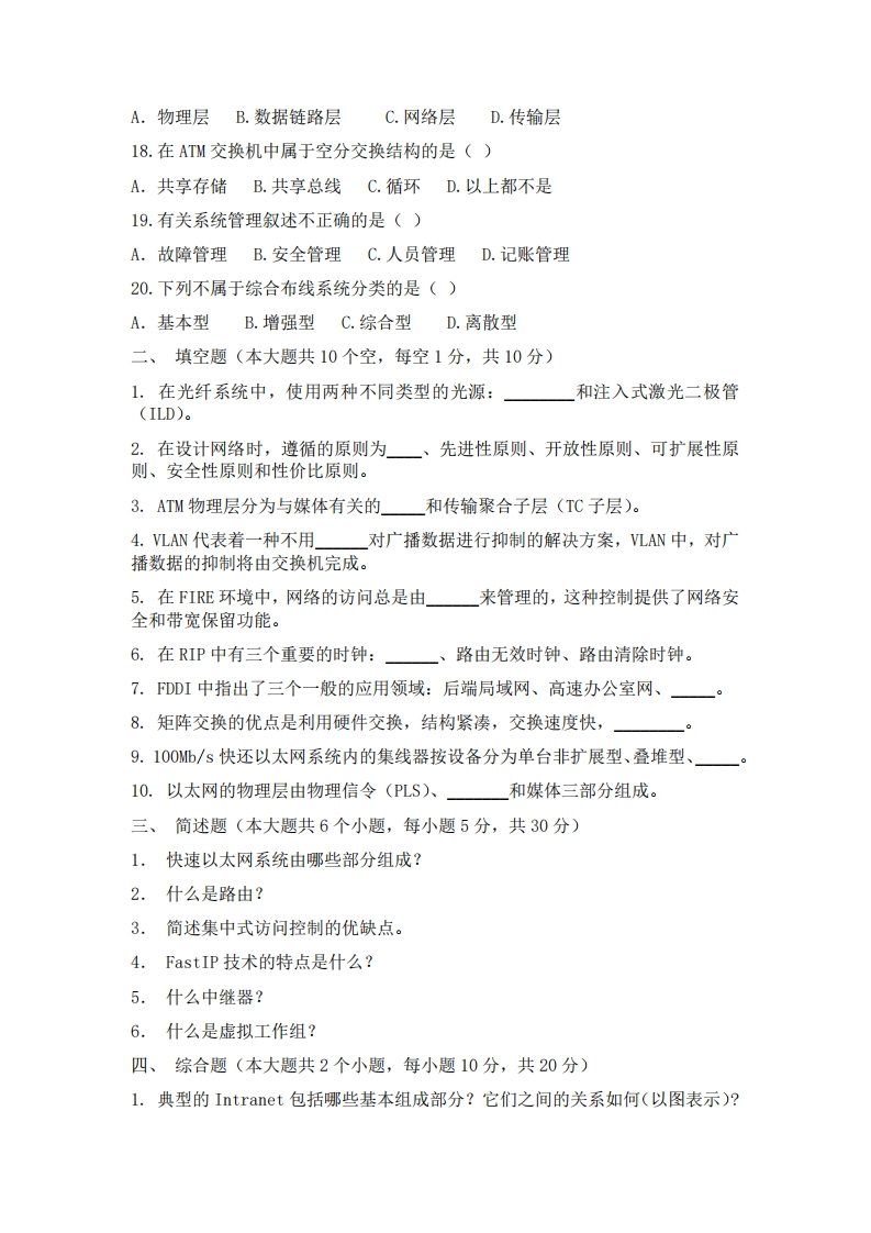 青海大学计算机课程期末试卷(2021-2022学年第一学期)考试形式:闭卷考试对象:考生姓名:考生学号:题号一三四总分分值单项选择题(本大题共20小题,每小题2分,共40分)1.下列不属于局域网拓扑结构的是()A.星型B.环型C.树型D.不规则型2.双绞线由两根具有绝缘保护层的铜导线按一定密度互相绞在一起组成,这样可()A.降低信号干扰的程度B.降低成本C.提高传输速度D.没有任何作用3.下列不属于10Base-T集线器接口的是()A.AUIB.BNCC.RJ45D.BUS4.在局域网中,由PLS模块对帧进行数据编码,它采用()A.不归零编码B.曼彻斯特编码C.差分曼彻斯特编码D.归零编码5.100Base-FX中多模光纤最长传输距离为()A.500mB.1kmC.2kmD.40km6.以下叙述错误的是()A.快速以太网兼容10Base-T/L方式B.10Mb/s和100Mb/s自适应是为了系统的扩充性C.10Mb/s和100Mb/s自适应是最大限度地保护了原来的投资D.快速以太网包括100Mb/s和1000Nb/s以太网7.使用了全双工以太网技术后,延伸网段距离上的得益者是()A.10Base-TB.100Base-T2