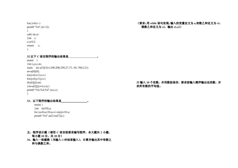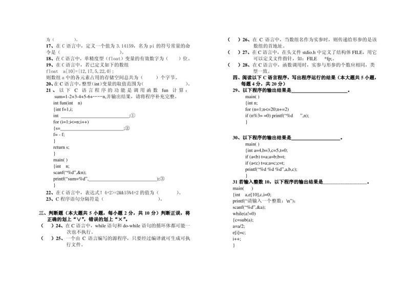 清华大学《C语言程序设计》期末试题2020F2021学年第一学期量a的值为()a=2+b+b+,b+8+b):题号四(1)132014(308(409愿分11.在C语言中定义如下数组得分intb[4][3]=1.3.2,(4,5.61,01):则数组元素b[2][2]的值为(本试卷共35题,满分100分时间为90分钟)(106(2560(402单项选择题(本大题共15小题,每小题2分,共30分)在2在C语言中,已知1,j.k为int型变量,若从健盘输入456回车,每小题列出的四个备选项中只有一个是符合题目要求的,请将其代要使i的值为4,j的值为5,k的值为6,以下迷项中正确的输入语码填写在题的括号内。错选、多选或未选均无分。句是()1.在C语言程序中,ain()函数的位置()(1)scanf "%2d%22d",I,j.k):(2)scanf "d%d",&&j):装():必须作为第一个函数(2必须放在用户自定义函数之后(3 scanf(“d,,d”,k1,&j.&k):()可以任意们必须作为最后一个函数(4)scanf("i=%d j=d,k=%d",&I,&j.&)2.C语言提供的合法关键字是()13在C语言中,设a为整型变量,要求当a的值为偶数时,表达式的(1)AUTO (2)short unsignd (4)count值为“真”,的值为奇数时,表达式的值为“假”,以下不满足要求3在C语言中,下列哪个字符为合法的字符常量(的表达式是()(1)°084(2”/x45”(30”bm(07"(1归%2=0(01(a2=1)a%2(01a2】4在C语言中,以下四种运算符中,优先级最高的运算符是()14在C语言中对下列数组初始化中不正确的是()(1》■(2公从(3+=(01=(I)char a[]="ABCDEF":(2char a[5]=(65,66)5.在C语言中,表达式18/4s0t4.0)值的数据类型是()(3 char a[5]=(A','B”,'CJ:(1)int位)f10at31org(4Xouble(4 char a[5]='AeDE”:6.在C语言中,表达式sizeof(1omg的值为()15以下C程序段的输出结果是()(0)122(3A(408nain(7.在C语言中,若已定义x和y是doub1e型变量,且=1,则表达式{ntx12,y=10,z=0:y=以+3/2的值是(if(x