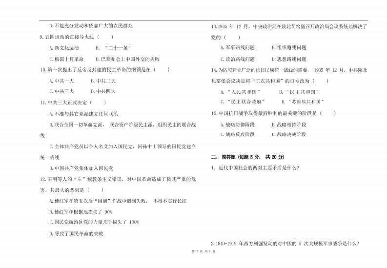 C,太平天国运动D.辛亥革命清华大学2022-2023学年第一学期4.帝国主义列强对中国的争夺和瓜分的图谋达到高潮是在()《中国近现代史纲要》A,鸦片战争B.中法战争C,甲午战争D.八国联军侵华期末考试试卷(从卷)5.戊戌雏新前维新派与守旧派的这场论战,实质上是()注意:1、考试时间:90分钟2、所在教学点、班级、姓名、学号必须写在指定地方:A资产阶级思想与封建主义思想在中国的第一次正面交锋题号二三四总分B,守旧派与洋务派之间的一次论战得分C.保皇派与革命派的一次论战D.帝党与后党的权力之争一、选择题(以下每题的选项中,只有一项最符合题意。每题2分,共306,中国民族资产阶级登上政治舞台的第一次表演是在()分)A洋务运动B.戊戌雏新1,第一次鸦片战争后美国迫使清政府签订的不平等条约是()】C,辛亥革命D,五四运动9A.《南京条约》B.《虎门条约》7.孙中山将同盟会的纲领概括为三大主义,其中民权主义(创立民国)即C,《望厦条约》几.《黄埔条约》年()2.随着近代中国从封建社会逐步演变为半殖民地半封建社会,地主阶级本A.民族革命B.政治革命学身也发生了某些变化,出现了()C.社会革命D.资产阶级革命A.官像买办资木家B.农民阶级8.辛亥革命的失败原因从根本上说,是因为()C.民族资本家D.官僚地主和城居地主A在帝国主义时代,在半殖民地半封建的中国,资本主义的建国方案密3.在粉碎帝国主义列强瓜分中国的斗争中发挥了重大的历史作用的事件是行不通的是()B.资产阶级革命派本身存在着许多弱点和错误A.义和团运动B戊戌维新C,中国民族资产阶级的软弱性和妥协性第1项共5瓦