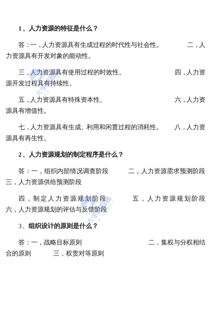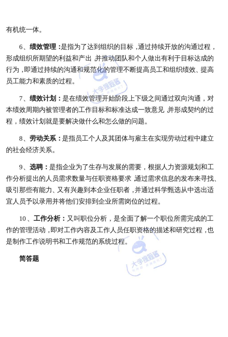 名词解释1、人力资源管理:就是现代的人事管理,它是指企业为了获取、开发、保持和有效利用在生产和经营过程中必不可少的人力资源,提高运用科学、系统的技术和方法进行各种相关的计划、组织、领导和控制活动,以实现企业的既定目标。2、同素异构原理:意指同样数量的人,用不同的组织网络连接起来,形成不同的权责结构和协作关系,可以取得完全不同的效果。3、“X理论”的人性假设:人生来就是懒惰的,只要可能就会逃避工作;人生来就缺乏进取心,不愿承担责任,宁愿听从指挥;人天生就以自我为中心,漠视组织需要;人习惯于守引旧,本性就反对变革;只有极少数人才具有解决组织问题所需要的想象力和创造力;人缺乏理性,容易受外界的影响4、“Y理论”的人性假设:要求工作是人的本性;在适当条件下,人们不但愿意,而且能够主动承担责任;个人追求满足欲望的需要与组织需要没有矛盾;人对于自己新参与的工作目标,能实行自我指挥与自我控制;大多数人都具有解决组织问题的丰富想象力和创造力。5、人力资源战略:企业关于人力资源管理活动的总体谋划,它以维持和发展企业竞争优势为目的,以企业总体战略、经营战略为背景,以人力资源管理实践为支撑,是关于企业人力资源管理目标、政策、行为的