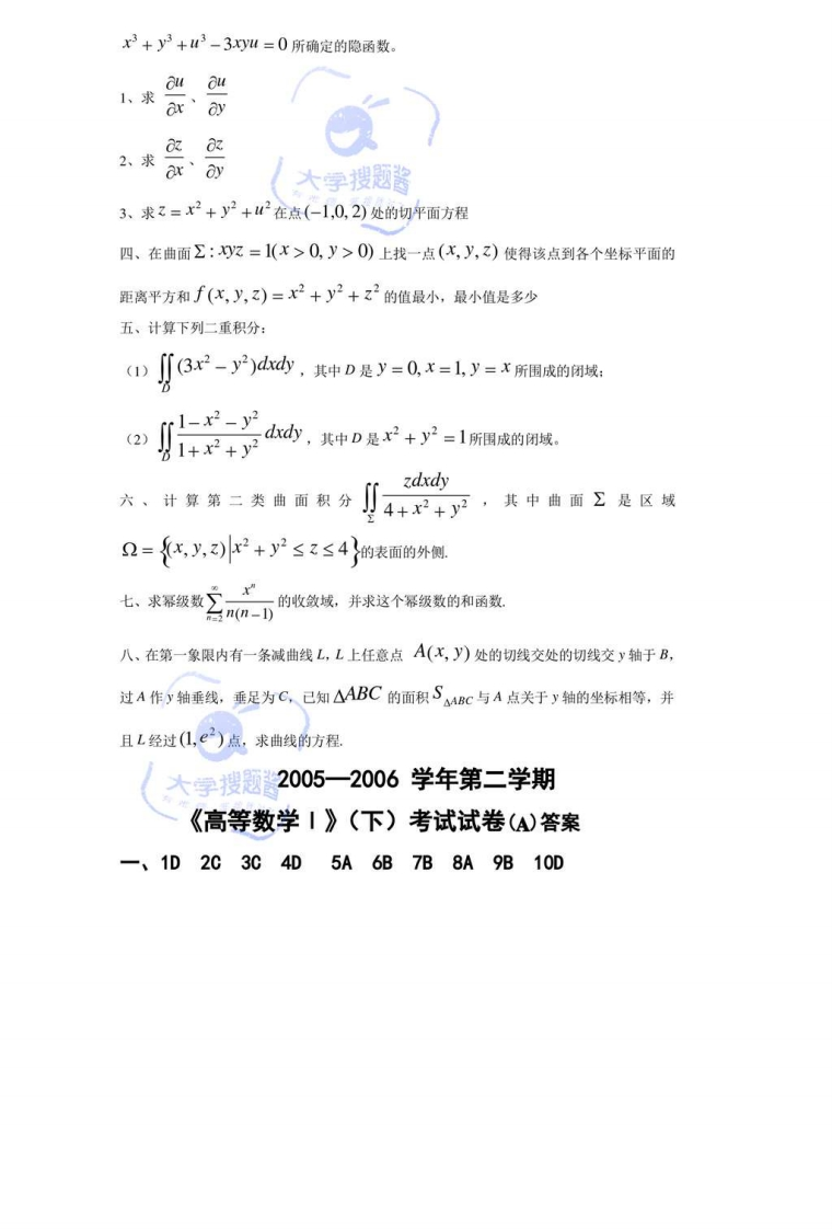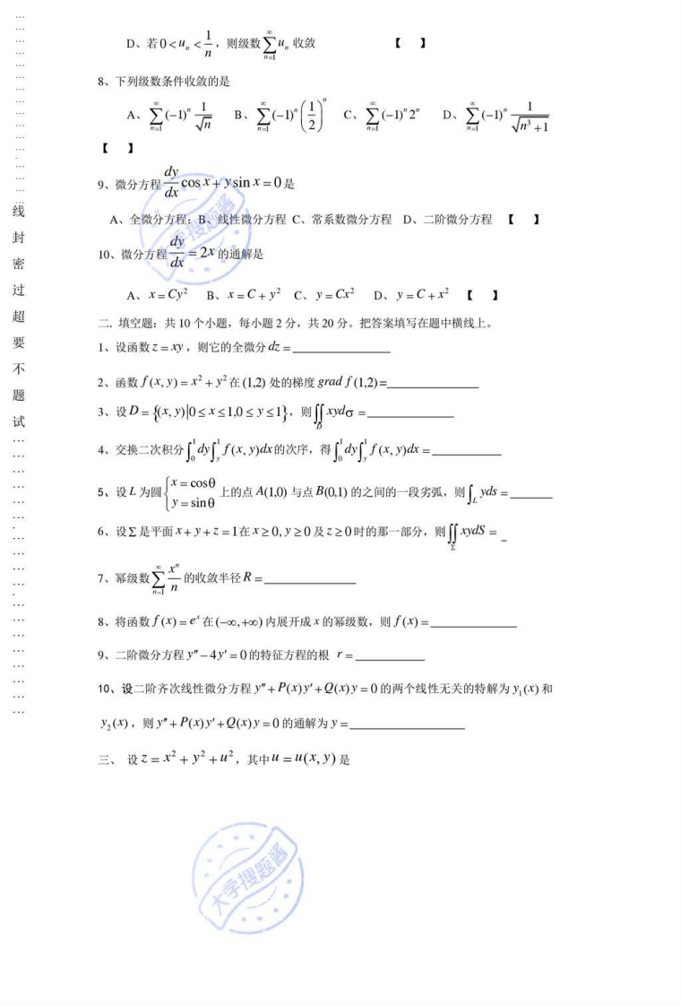 三峡大学高数期末试题_565492猴哥6个月前更新关注私信0.33MB4页03228三峡大学高数期末试题_565492此内容为付费资源,请付费后查看10积分年度会员免费月享会员免费登录购买付费资源已售 501 第1页 / 共4页 第2页 / 共4页 第3页 / 共4页 试读已结束,还剩1页,您可下载完整版后进行离线阅读 © 版权声明文章版权归作者所有,未经允许请勿转载。THE END《三峡大学》期中期末历年真题期末试卷 文本预览 2005—2006学年第二学期《高等数学I》(下)考试试卷(A)一,选择题:共10个小题,每小题2分,共20分。在每小题给出的四个选项中,只有一项是符合题目要求的,把所选项前的字母填在题后的括号内。1、二元函数z=f(x,y)=lnx的定义域是A、>0}B、{>1}C、x,p>0y>0}©大字搜题酱D、{x,)r>0,-0 查看更多 收起部分 喜欢就支持一下吧点赞28赞赏 分享QQ空间微博QQ好友海报分享复制链接收藏 猴哥关注 04.7W+0281261W+ 北京理工大学-睿信书院-《复变函数与积分变换》2018-2019学年期末试卷B卷北京理工大学-睿信书院-《复变函数与积分变换》2018-2019学年期末试...6个月前 2.3W+北京理工大学《计算机基础》2018-2019学年期末试卷北京理工大学《计算机基础》2018-2019学年期末试卷6个月前 2.3W+北京理工大学《高等数学》2019-2020学年期末试卷北京理工大学《高等数学》2019-2020学年期末试卷6个月前 2.3W+北京理工大学数据结构期末试卷北京理工大学数据结构期末试卷6个月前 2.3W+北京理工大学《计算机基础》2017-2018学年期末试卷北京理工大学《计算机基础》2017-2018学年期末试卷6个月前 2.3W+北京理工大学-睿信书院-《复变函数与积分变换》2016-2017学年期末试卷A卷北京理工大学-睿信书院-《复变函数与积分变换》2016-2017学年期末试...6个月前 2.3W+ 上一篇 人体解剖生理学题库_11607663 下一篇 三峡大学期末真题《概率论与数理统计1》试卷答案_583379 相关推荐 北京理工大学-睿信书院-《复变函数与积分变换》2018-2019学年期末试卷B卷北京理工大学-睿信书院-《复变函数与积分变换》2018-2019学年期末试卷B卷6个月前 2.3W+北京理工大学《计算机基础》2018-2019学年期末试卷北京理工大学《计算机基础》2018-2019学年期末试卷6个月前 2.3W+北京理工大学《高等数学》2019-2020学年期末试卷北京理工大学《高等数学》2019-2020学年期末试卷6个月前 2.3W+北京理工大学数据结构期末试卷北京理工大学数据结构期末试卷6个月前 2.3W+北京理工大学《计算机基础》2017-2018学年期末试卷北京理工大学《计算机基础》2017-2018学年期末试卷6个月前 2.3W+北京理工大学-睿信书院-《复变函数与积分变换》2016-2017学年期末试卷A卷北京理工大学-睿信书院-《复变函数与积分变换》2016-2017学年期末试卷A卷6个月前 2.3W+ 评论 抢沙发 请登录后发表评论 登录 注册 暂无评论内容
