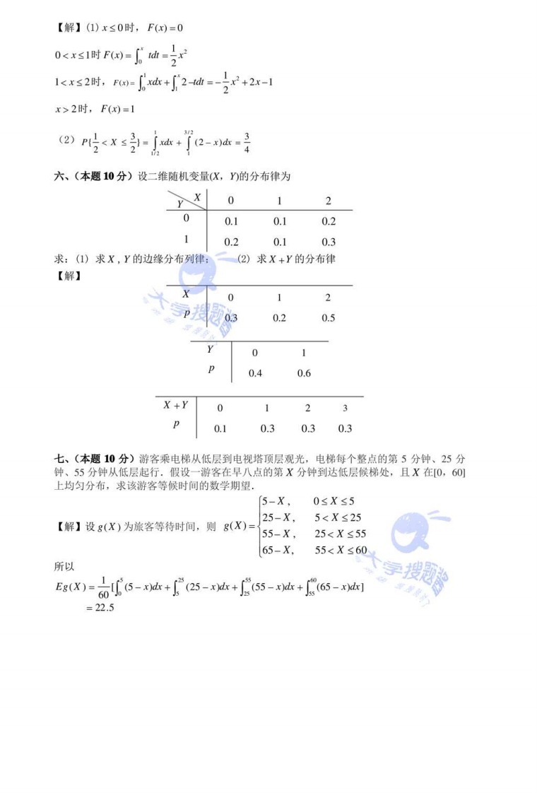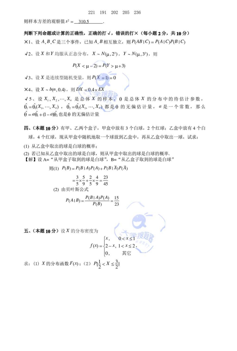 2014年秋季学期《概率论与数理统计I》参考答案1、一枚硬币掷两次,A表示“两次都掷到正面”,那么A的对立事件是().A.“至少掷到一次反面”B.“恰好掷到一次反面”C.“恰好掷到一次正面”D.“两次都掷到反面”Cx,003、设随机变量X分布函数为F()=0x≤0则2X的分布函数为Fx(x)=J1-ei,x>00x≤04、设二维随机变量(X,Y)~N(仙,山,c,o,p),则cov(X,)=-s,o,P-·5、从总体中随机地抽取容量为5的样本,其观察值为:大学搜题酱