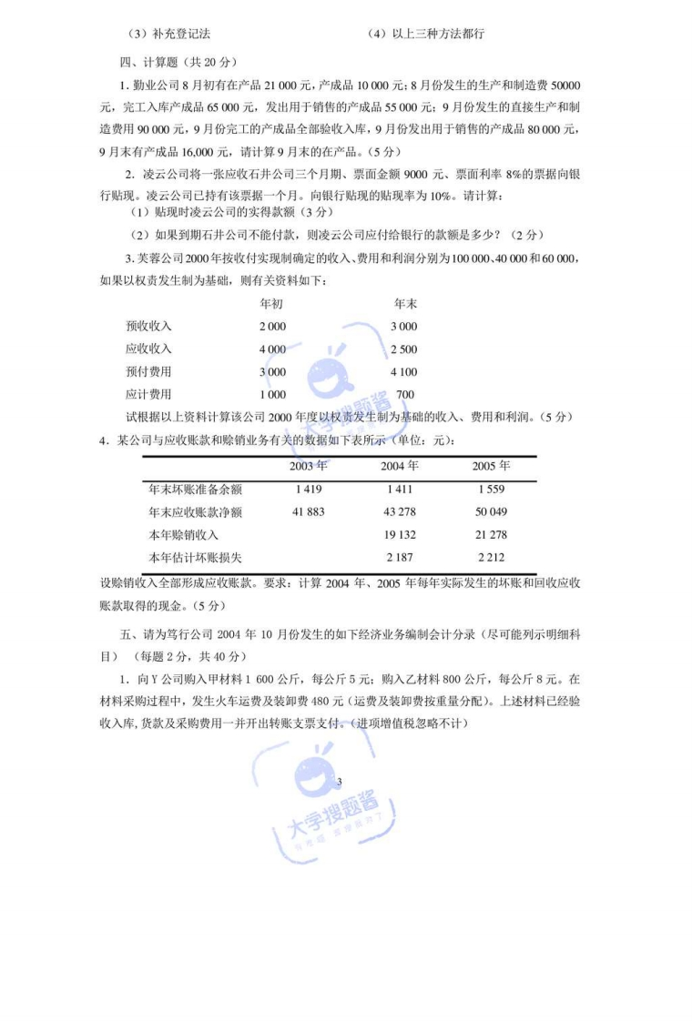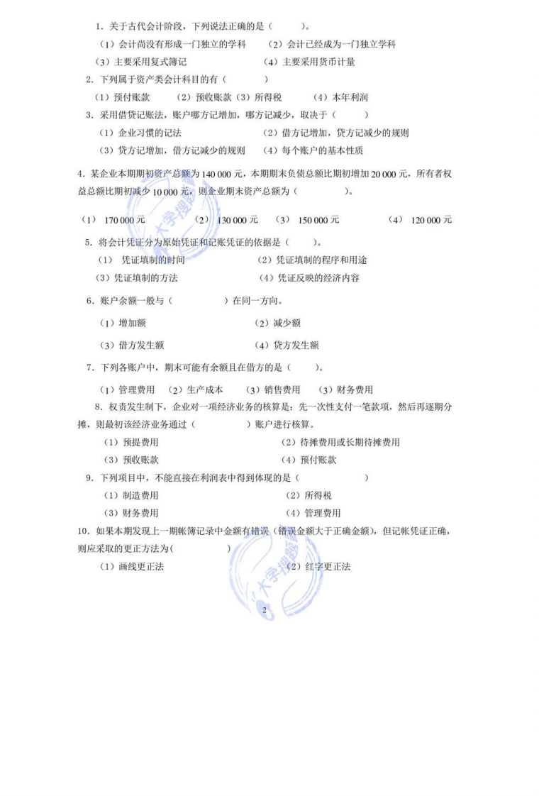 一、填空题(每题1分,共10分)1.()的出现,是近代会计发展为现代会计的重要标志。2.会计是一个以生成()信息为主的经济信息系统。3.记账凭证不论采用何种形式,具有多少种类,它与原始凭证的本质区别在于它载有4.我国最早关于设置会计的官职和官方进行会计活动的记载是()。5.如果企业从银行提取现金,应当填制的专用记账凭证是(6.1494年,意大利数学家)出版了他的《算术·几何·比与比例概要》一书,系统地介绍了威尼斯的复式记账方法。7.费用的确认原则包括权责发生制原则、()和划分收益性支出与资本性支出原则。8.企业的呆帐收入应计入的帐户为()。9.分期收款销售应在()时确认收入。10.对应收账款坏账采取直接冲销法的两个主要缺点是虚估企业资产和违反(原则二、判断题(每题1分,共10分)1.账户期末余额的大小由本期借、贷发生额的大小所决定()2.应收账款采用总价法核算的情况下,购货方享受的现金折扣应通过主营业务收入帐户核算3。登记总账与所属明细账的原则是根据总账记明细账()4.若某公司2006年11月31日“本年利润”账户贷方余额为100000元,则表示该公司2006年11月份共实现净利润为100000元()。5.虽然企业期初结存的材料单位成本和本月购买的各批次材料的单位成本都不一样,但是无论按照先进先出法还是按照月末一次加权平均法计算,其本期发出材料的成本都是一样的6。如果按照备抵法中的应收账款余额百分比法计提坏账准备,则期末应该计提的坏账准备的发生额等于应收账款期末余额乘以计提坏账的比例(7.应收票据贴现时,企业确认的财务费用等于银行收取的贴现利息(8.企业收到银行存款利息应记入“财务费用”账户的贷方。()9.股份有限公司发行股票时,不论其股票的发行价格高于还是低于票面价值,都必须按照股票的票面价值记录“股本”账户()。10.资产负债表是反映一个会计主体在一定会计期间财务状况的报表()三、单项选择题(每题2分,共20分)