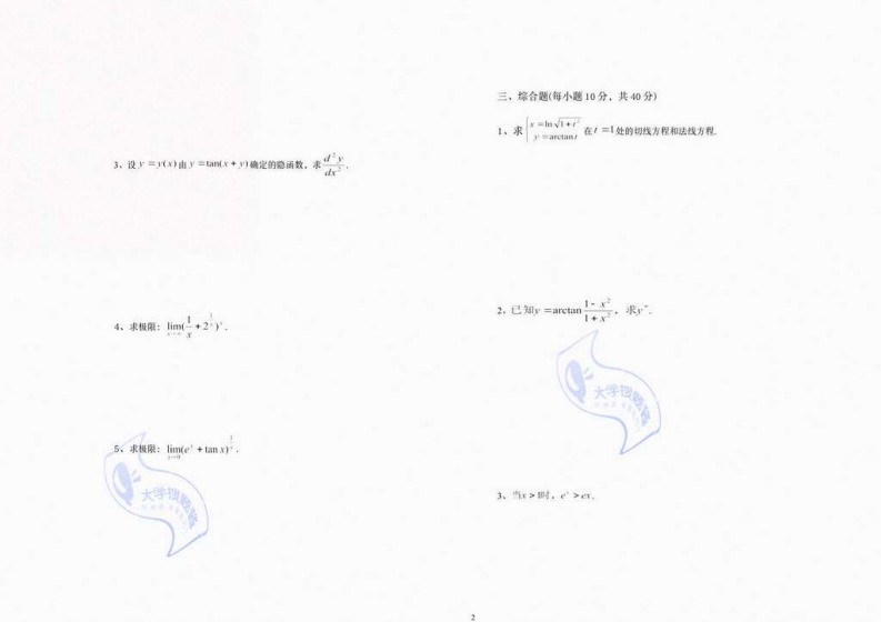 2020-2021学年第一学期A./(x)为连线用数B.x=为数的洗天新点订线高等数学1上)》试卷(A)C.x■:1为函数的可去可期点D.x■-为函致的无对回断一,选择题(每小题3分,共30分)2(x+D)arctan-x20-=(1.w,3(8,已知/x)=x=0,若im八x)存在.期a=(A.1B.0C.-1D.2arsin+sinar r<02.设/w)=e-3-1一期(1A.H=0B.1=7e:+A.x)为连续函数B.x=0为函取的跳跃可所点Cx=2为数的美跃间新点D.x=2为函数的可去创断点9.若m-o》=l则/o=()I-cosxA2 B.-1 C.2D-2(x+1)areco1x>03.已知r(x0x=0,若imf(x)存在,则a=《)10.设y=x'+。期w=()n(1+ax2】黄中停A.('(n+1)+a ltvB.(x'(In x+1)+a Ina)dex<0xsin xC.(x'(inx+1)+cosra Inaxdr D.Lx'Inx+cosxa InaldrA,0=0B.g=Tc号D.ds.二.计算证明题(每小题6分,共30分)4设可导,x=f4x1·n.期0)=0是)在。=0处可绿的(人小设y=由y=ar+)确定的隐函数。求A充分必要条作B.充分非必要条件C必要非克分条件D.既非克分又事必要条件5.设y=)+sm.期动=(士1+xA)m,+5xI+x1+xI+发1+Y1+x1+xc.(xY'dn)+snrD.-)+1+xI+rI+x6、im天学搜题+…+m+期(人有雅园苦漫孩对A0B.1C2D.-1,2搜题酱,西,在1=0处的切线方程和法线方程7,设/)=im·1有准