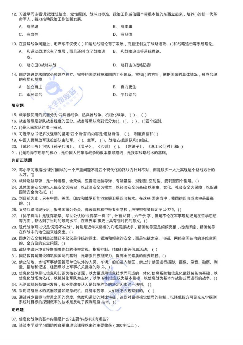 山东财经大学2020-2021学年第二学期期末试题A卷(军事理论课)选择题1、()中,中国割让台湾岛及其附属各岛屿、澎湖列岛给日本,赔偿日本2亿两白银。该条约适应了帝国主义列强对华资本输出的需要,随后列强掀起了瓜分中国的狂潮。A.《广州条约)B.《辛丑条约》C.《马关条约》D.《南京条约】2、2015年7月1日通过的《中华人民共和国国家安全法》,规定每年()为全民国家安全教育日。A.5月15日B.4月15日C.5月17日D.4月16日3、我国国防教育的原则是()大学搜题酱A.军事理论教育与军事技能训练相结合B.普及教育与重点教育相结合C.经常教育与集中教育相结合D.理论教育与行为教育相结合4、1945年9月2日,()在投降书上签字,标志着第二次世界大战的结束。A.德国B.日本C.意大利D.匈牙利5、()是关系军队现代化建设的战酪全局问题,也是赢得高技术战争的决定因素。A.高科技武器B.信息化程度C.现代化军事人才D.新军事革命6、温度高于()的任何物体都在不断向外发出红外辐射。A.-273CB.0℃C.273℃D.100C7、以下属于航空侦察监视平台的是()A.有人驾驶侦察机B.无人驾驶侦察机C.临近空间侦查器材D.预警机8、当代国家安全包括国民安全、领土安全、主权安全、(人经济安全、文化安全、科技安全、生态安全、信息安全等。A.政治安全B.军事安全C.人民安全D.情报安全9、高技术的应用,大大扩展了协同作战的范围。从总体上说,现代战争将是陆、海、空、天、()“五维一体的协同作战。A.电B.网C.电磁D.磁10、信息化装备对现代战争的影响主要有:()A.侦察立体化B.打击精巧化C.应高速化D.防护综合化E.控制智能化大字搜题酱11、指挥控制系统是军队的重要军事装备,它的同义词是()A.C4lB.C41C.C4ISRD.c31