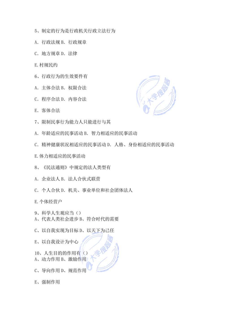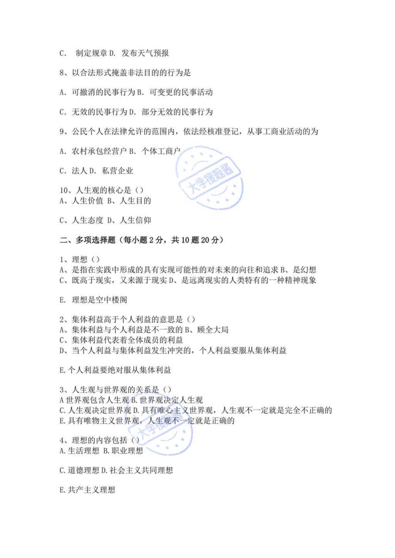 山东理工大学《思想道德与法治》20192020学年第一学期期未试卷一、单项选择题(每小题2分,共10题20分)1、在社会主义初级阶段,我们所提倡的高尚的人生目的是()A.“一切向钱看”的人生目的B.为个人求权力、求享乐的人生目的明g#弹宰出Y腿孩C.“平生无大志,但求足温饱”的人生目的2、为调整和规范人类社会生活三大领域,相应分别形成了()A、生活道德、职业道德、家庭道德B、生活道德、职业道德、社会公德C、社会公德、生活道德、职业道德D、社会公德、职业道德、家庭道德3、人生观的核心是()A、人生价值B、人生目的C、人生态度D、人生信仰4、道德品质的形成以()为要求。A,道德认同B.心理机制C.行为选择D.法律许可5、集体主义中的集体的本质意义表现为以()为核心的利益集团A、资产阶级B、农民阶级C、中产阶级D、无产阶级6、,某省政府办公厅以办公厅的名义发布一个有关该省城市环境卫生管理处罚的规范性文件,这一做法()A.是正确的B.是错误的,应当以省长的名义发布C.是错误的,省级政府无权规定行政处罚的事项D.是错误的,省政府办公厅是内部办公机构,无关对外实施公共管理职能,7、以下()的行为,不属于行政行为A.吊销执照B.征税