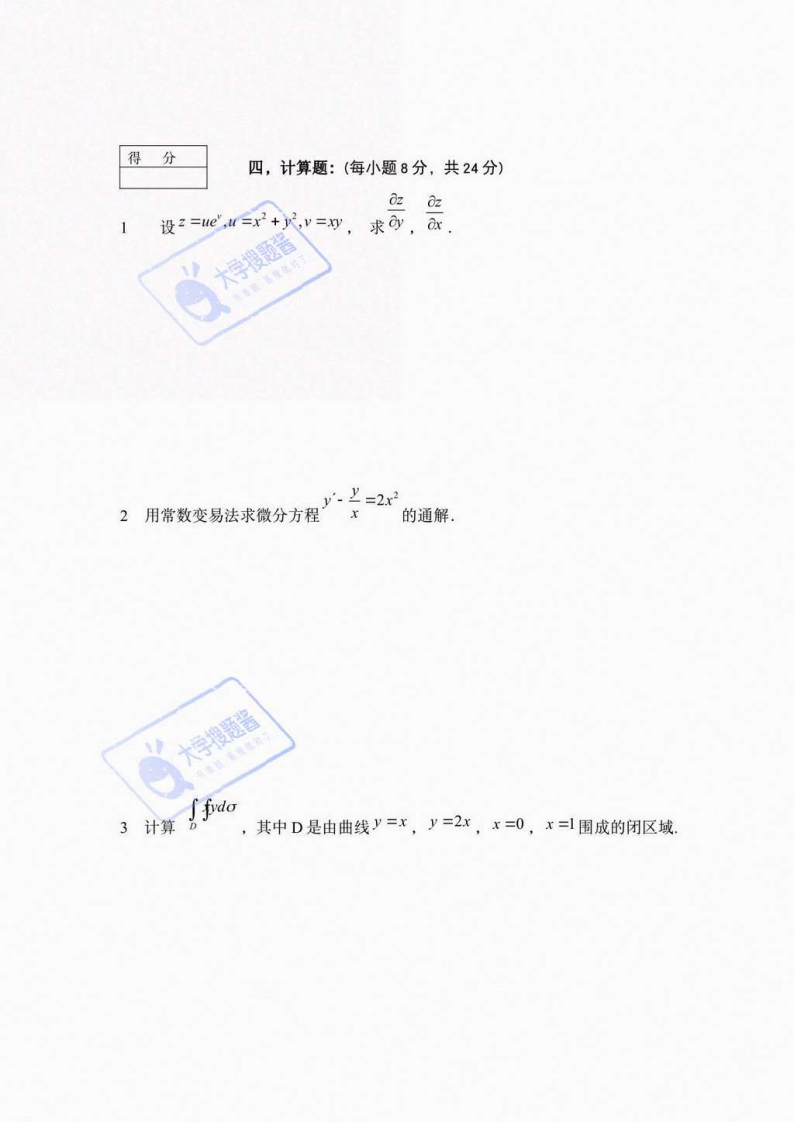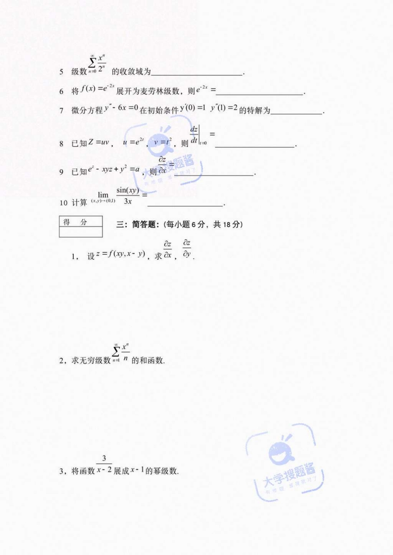 陕西师范大学《高等数学》2020-2021第一学期期末试卷题号二三四五六总分评阅总分大题分1530182485100得分一、单项选择题:(每小题3分,共15分)f(x,y)=1,若R+y,则fB4)=【】.1225B 5c12D122,函数x,=1-xy的定义域为大学搜题酱Ax∈RBc+y判Cc+y3D(.)3,数3n【】A条件收敛B绝对收敛C发散D无法确定4,微分方程y·y~2y=0的通解为【】Ay =ce By=ce"+cecy=ce+ce'Dy=ce+ce5函数/(x,)=4(x-y)-x2.y2【】A有极小值f2,-2)8B有极大值f2,-2)=8C无极值D极值无法判断得分二、填空题题:(每小题3分,共30分)1若4=x2+广+z+3z,则dan=●大学搜题酱2已知/(x川=r,则,,=3计算3加4交换积分顺序,则了了/xd=