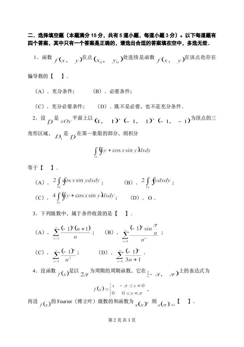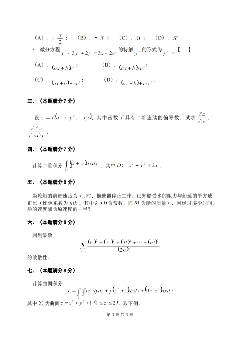 上海财经大学《高等数学》2020-2021学年期末试卷B卷猴哥6个月前更新关注私信0.64MB4页07235上海财经大学《高等数学》2020-2021学年期末试卷B卷此内容为付费资源,请付费后查看10积分年度会员免费月享会员免费登录购买付费资源已售 501 第1页 / 共4页 第2页 / 共4页 第3页 / 共4页 试读已结束,还剩1页,您可下载完整版后进行离线阅读 © 版权声明文章版权归作者所有,未经允许请勿转载。THE END《上海财经大学》期中期末历年真题期末试卷 文本预览 上海财经大学2020-2021学年第二学期高等数学期末考试试卷(B卷)学院专业班级学号姓名题号二三四五六七八九十十一总分得分阅卷人(请考生注意:本试卷满分100分,共十一道大题.)一.填空题(本题满分15分,共有5道小题,每道小题3分),清将合适的答案填在空中.设:=n(r+yr则1.2.交换累次积分的顺序/(x,ydiv(grad3.设4.设幂级数∑anx”的收敛半径为R,幂级数∑bnx”的收敛半径为R2,=0且0 查看更多 收起部分 喜欢就支持一下吧点赞35赞赏 分享QQ空间微博QQ好友海报分享复制链接收藏 猴哥关注 04.7W+0281261W+ 北京理工大学-睿信书院-《复变函数与积分变换》2018-2019学年期末试卷B卷北京理工大学-睿信书院-《复变函数与积分变换》2018-2019学年期末试...6个月前 2.3W+北京理工大学《计算机基础》2018-2019学年期末试卷北京理工大学《计算机基础》2018-2019学年期末试卷6个月前 2.3W+北京理工大学《高等数学》2019-2020学年期末试卷北京理工大学《高等数学》2019-2020学年期末试卷6个月前 2.3W+北京理工大学数据结构期末试卷北京理工大学数据结构期末试卷6个月前 2.3W+北京理工大学《计算机基础》2017-2018学年期末试卷北京理工大学《计算机基础》2017-2018学年期末试卷6个月前 2.3W+北京理工大学-睿信书院-《复变函数与积分变换》2016-2017学年期末试卷A卷北京理工大学-睿信书院-《复变函数与积分变换》2016-2017学年期末试...6个月前 2.3W+ 上一篇 上海财经大学《高等数学》2020-2021学年期末试卷A卷 下一篇 上海财经大学《会计学》2019-2020学年期末试卷 相关推荐 北京理工大学-睿信书院-《复变函数与积分变换》2018-2019学年期末试卷B卷北京理工大学-睿信书院-《复变函数与积分变换》2018-2019学年期末试卷B卷6个月前 2.3W+北京理工大学《计算机基础》2018-2019学年期末试卷北京理工大学《计算机基础》2018-2019学年期末试卷6个月前 2.3W+北京理工大学《高等数学》2019-2020学年期末试卷北京理工大学《高等数学》2019-2020学年期末试卷6个月前 2.3W+北京理工大学数据结构期末试卷北京理工大学数据结构期末试卷6个月前 2.3W+北京理工大学《计算机基础》2017-2018学年期末试卷北京理工大学《计算机基础》2017-2018学年期末试卷6个月前 2.3W+北京理工大学-睿信书院-《复变函数与积分变换》2016-2017学年期末试卷A卷北京理工大学-睿信书院-《复变函数与积分变换》2016-2017学年期末试卷A卷6个月前 2.3W+ 评论 抢沙发 请登录后发表评论 登录 注册 暂无评论内容