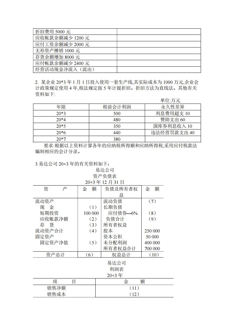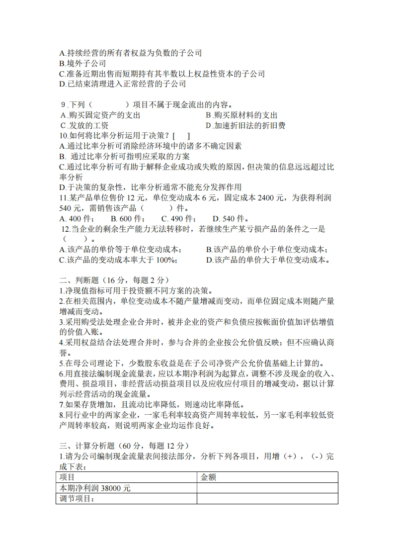 上海财经大学《会计学》课程考试卷(A)2019—2020学年第二学期期末试卷姓名学号班级题号二三总分得分一、单项选择题(24分,每题2分)1.下列()项目不属于年金。A等额的分期收入款B.固定成本C.直线法的折旧费D等额的分期付出款2.长期投资决策的评价指标是以()为基础。A.税前利润B税后利润C.边际贡献D现金流量3.下列()项目不属于现金流出的内容。A.固定资产的安装费B.分配来的固定费用C.流动资金的投资D开发资源发生的现金支出4若半成品进一步加工再出售,则要求(A.成品出售的收入大于半成品出售的收入:B.成品出售的收入大于追加成本:C.成品出售的收入减去追加成本的差额大于半成品出售的收入:D.成品出售的收入减去追加成本的差额大于半成品出售的收入减去原成本的差额。5.采用购受法处理企业合并时,负商誉应按下法进行会计处理:A.将负商誉分摊到除长期有价证券以外的非流动资产上B.将负商誉分摊到除长期有价证券以外的流动资产上C将负商誉分摊到除长期投资以外的非流动资产上D.将负商誉分摊到固定资产上6.某公司控股A公司70%股权,在编制合并报表时对少数所有者权益的处理采用母公司理论。公司合并时的净资产的帐面价值为868万元,净资产的公允价值为1200万元,请计算少数所有者权益。A.207.6B.260.4C.840D.3327如果内部收益率等于设定的折现率,说明()。A.净现值一定小于零B.净现值一定大于零C.净现值一定等于零D现值系数一定等于零8.下列公司中,应排除在母公司合并会计报表合并范围之外的有()