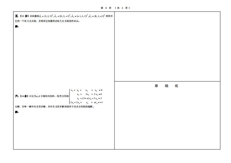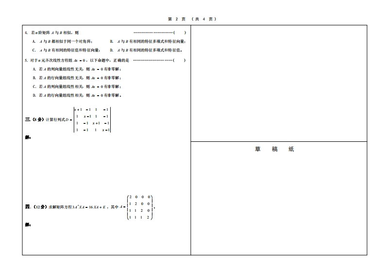 第1页〔共4页)成二单项进弄■(本大共5小■。第小■2分,共分,在年小■的四个渔项中收有一个正,上海大学2019~2020学年春季学期试卷(A卷)请将正南的边物号填在指号内)绩1.设A是网X:矩阵,B是网矩阵,则课程名:线性代数(B)课程号:01013010学分:3A当刷>:时,您有中0:且当刚>:时,您有4B-0:应试人声明:我保证遵守《上海大学学生手册》中的《上海大学考场规则》,如有考试违纪、作C.当两《:时,您有单0:D当周《H时,您有|-0,弊行为,愿意接受《上海大学学生考试违纪、作弊行为界定及处分规定)的纪律处分.工设A和B都是和阶方阵,下列正确的是应试人应试人学号应试人所在院系A(4+B)-4+248+B:且(A+)-A+B:题号三②五六七C.若h-o,则-0或-0:D.(4B)-4B".得分王设A和B都是阳阶丰零方阵,且A昼一O,则A的肤经一填空意本大共1空,空2升,共地丹)L等于:且小于阳:C.大于:D不伦确定。1.没A和岳都是3阶方阵,若-8,2,则2-2.若4阶行列式的第1行元素依次为-10,2,@,第4行元素的余子式依冰为5,10,4,-1,则草稿纸王当a和满足时,向量组G-1,l,),,-a,0,b),C,-0,2,3线性无关。4设A为4阶方阵,且R(A0▣2,则(了)■5.没叫,:均是方程组4-b的解,若,+之立,也是4-b的解,则k一6当a=时,向量(-3,4,0,与向量(-1多4,正交。1.设4是3阶方阵,若1,-1是4的特征值,且A与对角阵g(1,1,2)相似,则&已知A为阳阶方阵,其每行元素的和均为a,则A有一个特征值」和一个特征向量」9.当:的取值忘国是时,二次型f一+2x,++正定.注:教师应使用计算机处理试魏的文字、公式、图表等:学生应使用水笔成遇球笔管翘。