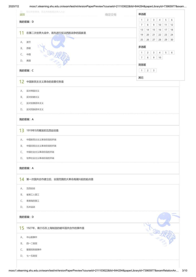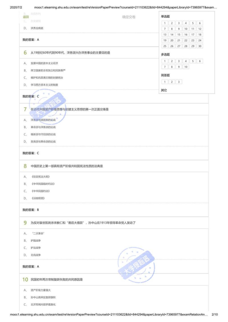 2020/72mooc1.elearning.shu.edu.cn/exam/test/reVersionPaperPreview?courseld=211103622&tld=844294&paperLibraryld=73965977&exam...返回确定交卷单选题123456中国近现代史纲要B2019-2020春季学期试卷A789101112131415161718题量:44满分:100.0截止日期:2020-07-0210301601"192021222324252627282930一、单选题多选题1234561认识中国近代一切社会问题和革命问题的最基本的依据是认识©大学搜题酱78910简答题A.中国近代社会轻济结构的变化过程123B.中国近代社会近代化的历史过程其它C.中国近代民族民主革命的性质D.中国近代社会半殖民地半封建的性质我的答案:D2在近代中国,民族资产阶级在政治上的两面性是A斗争性和进步性B.革命性和妥协性买办性和反动性D保守性和软站性我的答案:B3在近代,帝国主义列强不能灭亡和瓜分中国的最根本原因是A.帝图主义列阻之问的矛盾和妥协B.洋务派开网的"自强”、“求富运动C.民线资产阶级发动的民主革命0中华民拔进行的不屈不的反侵略斗争©大学搜题酱我的答案:D4在甲午战争后,宣传“物竞天择、“适者生存”社会进化论思想的著作是A.严复翻译的(天清论】B、郑现应洲写的《藏世危言】C.冯桂芬搅写的《校庐抗议)D.现源璃撰的《海四图志》我的答案:A5太平天国由盛而衰的转折点是A、天京事变mooc1.eleaming.shu.edu.cn/exam/test/reVersionPaperPreview?courseld=211103622&tld=844294&paperLibraryld=73965977&examRelationAn...1/10