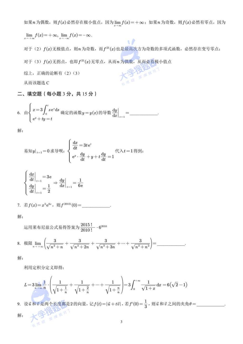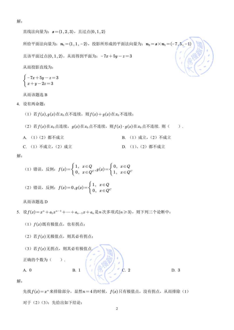 上海交通大学2018-2019学年第一学期《高等数学A》期未考试题A卷及答案解析一、单项选择题(每小题3分,共15分)个l.当x→0时,f(x)=x-sinx+tedt是x的k阶无穷小,则k=()A.3B.4c.5D.6解:洛必达与泰勒齐飞:典9兰1-cosz+22e*2+2+o6e到+0-=lim→0krk-1从而k一1=2→k=3从而该题选A2.若1=a,=月ctane也h=na+dc,则().A.I>12>IsB.I>Is>I2C.I2>>IsD.I2>Is>I解:只需要比较arcsinz,arctanz,ln(1十x)的大小即可,由它们导函数比较:作[0,x司上的定积分得到:ln(l+x)≤arctanz≤arcsinz从而:11>I2>3从而该题选A3.直线x=”2=。2在平面x+y-2:=3上的投影直线的方程为()。{,-7x+5y-z=3B.{x+y-2=3-7r+y+257x+5g-2=3x+y-2z=3D.x+y-2z=3