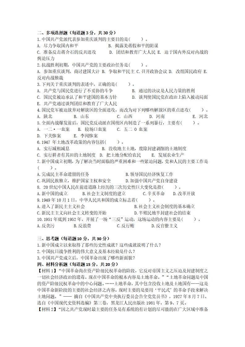 上海交通大学试卷(期末卷)(2016至2017学年第1学期)班级号学号姓名课程名称中国近现代史纲要(B卷)成绩一、单项选择题(每道题2分,共20分)1.中国共产党提出过渡时期的总路线,开始实施和执行第一个五年计划是在()。A.1951年B.1952年C.1953年D.1954年2.中国新民主主义革命基本胜利的标志是()。A.三大战役的胜利B.《共同纲领》的颁布C.国民党逃亡台湾D.中华人民共和国成立3.中国形成了全方位、多层次、宽领域的对外开放格局的标志是(A.邓小平南巡谈话发表B.2001年加入世界贸易组织C.中共十六大召开D.中共十五大召开4.十年社会主义建设探索时期,我国经济建设的最大成就是()。A.找到了一条具有中国特色的工业化道路B.基本建立了独立的、比较完整的工业化体系和国民经济体系C.核武器研究成功,奠定了我国核大国的国际地位D.外交工作最终打开新的局面,中美关系和中日关系得到改善5.中国的封建社会前后延续了()。A、一千多年B、二千多年C、三千多年D、四千多年6.中国进入近代社会的标志性事件是()。A、15世纪前期郑和下西洋B、1644年清兵入关,清王朝建立C、1840年鸦片战争爆发D、19世纪六、七十年代中国资本主义产生7.鸦片战争成为中国近代史的起点,这是因为随着西方列强的入侵,()。A、中国逐步成为半殖民地半封建国家B、中国社会主要矛盾发生变化C、中国逐渐开始了反帝反封建的资产阶级民主革命D、中国革命属于世界无产阶级革命的组成部分8.中国近代第一个不平等条约是(A、《北京条约》B、《天津条约》C、《望厦条约》D、《南京条约》9.近代中国社会最主要的矛盾是(A、帝国主义和中华民族的矛盾B、地主阶级和农民阶级的矛盾C、封建主义和人民大众的矛盾D、工人阶级和资产阶级的矛盾10.《南京条约》的签定时间是()。A、1940年B、1842年C、1895年D、1901年