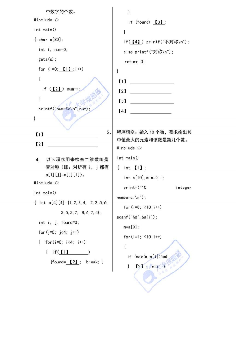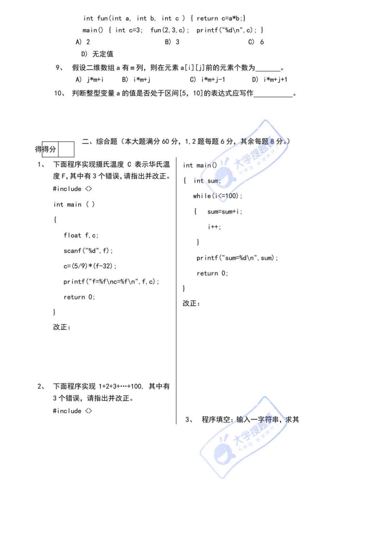 上海师范大学标准试卷、学年第学期考试日期年月日(考试时间:90分钟)科目:C语言程序设计(模拟卷)专业本科年级班姓名学号嫂题酱题号三总分得分我承诺,遵守《上海师范大学考场规则》,诚信考试。签名:得得分一、选择和填空题(本大题满分20分,每题2分。)1、把a1、a2定义成整型变量,并赋初值1的定义语句是2、有以下程序片段,请问执行后的输出结果是char a=8.c;c=a>=3;printf("%dn",c)3、有以下程序片段,若程序运行时从键盘输入48(字符0的ASC11码),则输出结果为charc1,c2;scanf ("%d".&c1)c2=c1+9:pr intf ("%c%cn".c1.c2)4、有以下程序片段,若程序运行时从键盘输入12,则输出结果为scanf ("%d".&x):if(x>15)printf ("%d".x-5):if (x>10)printf("%d".x):if(x>5)printf ("%dn".x+5)5、有以下程序片段,请问执行后的输出结果是char str []="ABCD":printf ("%dn".str[4]);6、若变量已正确定义,要将a和b中的数进行交换,下面不正确的语句是。A)a=a+b.b=a-b.a=a-b;B)t=a,a=b,b=t;C)a=t;t=b:b=a;D)t=b;b=a;a=t;7、下面程序段中循环体的执行次数是int j=0:do[j=j+1:]while(j>2);A)0次B)1次C)2次D)无限次8、以下程序的输出结果是