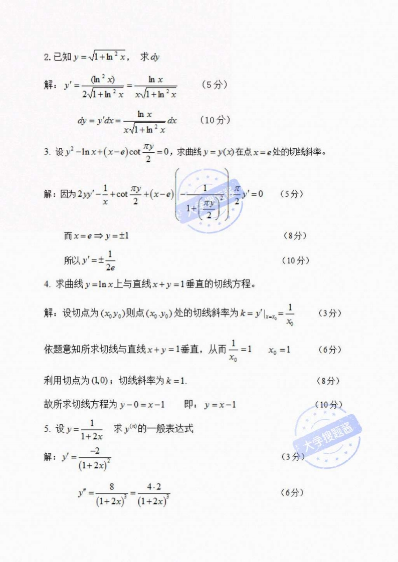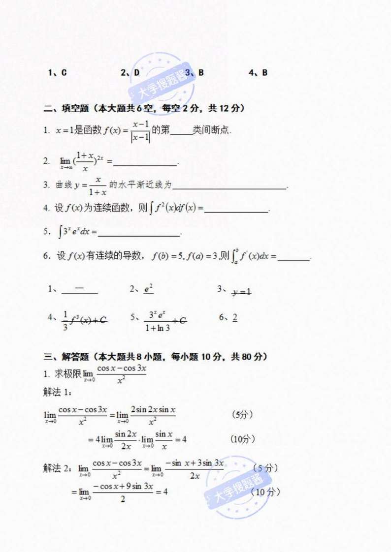 沈阳大学2020-2021第一学期高等数学(上)考试题C卷学院搜毯专业题号二三成绩学号得分姓名一、单项选择题(本大题共4小题,每小题2分,共8分)1、lim2”-1西3”+1【】(A)2-3(B)3-2(C)0(D)0(E)以上均不正确2设y=x”+e,则y网=【】(A)ex(B)n!(c)n!+ne*(D)n!+e*(E)以上均不正确3、F'(x)=fx).c为任意常数,下式成立的有学搜题酱【】(A)∫F()c=f)+c(B)f(x)dx=F(x)+c(C)「F(x)dk=F'(x)+c(D)「f(d=F(x)+c(E)以上均不正确4.设f)是连续函数,F()=f0d则F()=【】(A)f(x2)(B)2x(x2)(c)f()(D)xf(x)(E)以上均不正确