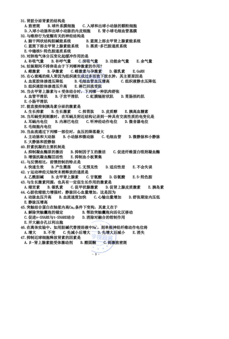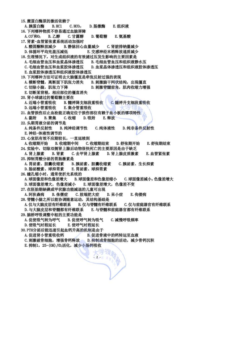 生理学1.当前负荷不变而增大后负荷时,以下错误的叙述是A.肌肉收缩的张力增大B.肌肉缩短开始的时间推迟C.肌肉缩短的初速度减小D.肌肉缩短的程度增大E.肌肉缩短的程度减小2.GABA受体激活时A.直接增加后膜的C1电导B.直接增加后膜的电导C.通过c蛋白而使C1电导增加D.通过G蛋白而使r电导增加E.通过G蛋白而使Na电导降低3.异相睡眠有利于A.促进体力的恢复B.促进精力的恢复C.加速细胞增殖和分化D.增进食欲和促进消化吸收E.促进机体的生长发育4.心肌收缩能力的增强可通过下列哪一途径实现A.增加兴奋时肌浆内Ca“浓度C.增加参与收缩的肌纤维数目B增加肌小节的初长度编新D.心肌发生完全强直收缩E.降低主动脉的血压水平5.不属于第二信使的物质有A.cAMP B.cGMP C.DGD.ATP E.IP,6.当去甲肾上腺素与B受体结合时,下列哪一种肌肉收缩或收缩加强A.心房心室肌B.子宫平滑肌C.小肠平滑肌D.血管平滑肌E.支气管平滑肌7.当糖尿病病人血糖浓度为300g/100加1时,下列哪项指标高于正常A.尿量B.细胞内液量C.血钠浓度D.动脉pH值E.动脉血Pco8.健康成年人在强体力劳动时,心输出量约可达到A.5~6L/min B.30L/minC.60L/minD.120L/minE.150L/min9.下丘脑是皮层下A.重要的感觉中枢B.重要的运动中枢C.较高级的交感中枢D.较高级的副交感中枢E.较高级的内脏活动调节中枢10.大量失血时首先发生的反应是A.心率降低B.脑和心脏的血管收缩C.肾脏排出Na增多D,循环血液中儿茶酚胺减少E.外周阻力增加11.排卵后黄体菱缩是由于血中哪种激素水平下降?A.促卵泡激素水平下降B.黄体生成素水平下降C.促卵泡激素和黄体生成素水平下降D.雌激素水平下降E.孕激素水平下降12.动物实验显示,静脉注射乳酸后呼吸运动增强,主要通过刺激下列哪一途径而实现A延髓呼吸中枢B.脑桥呼吸中枢C.中枢化学敏感区D.颈动脉体和主动脉体感受器E.颈动脉窦和主动脉弓感受器13.位于消化管纵形肌和环形肌层之间的神经丛称为A.内在神经丛B.欧氏神经丛C.壁内神经丛D.麦氏神经丛E.黏膜下神经丛14.胸廓处于自然位置时A.胸廓缩小,弹性阻力向外B.胸廓扩大,弹性阻力向内C其弹性阻力是吸气的阻力D.其弹性阻力是呼气的阻力E.胸廓无变形,不表现出弹性阻力大学搜题酱