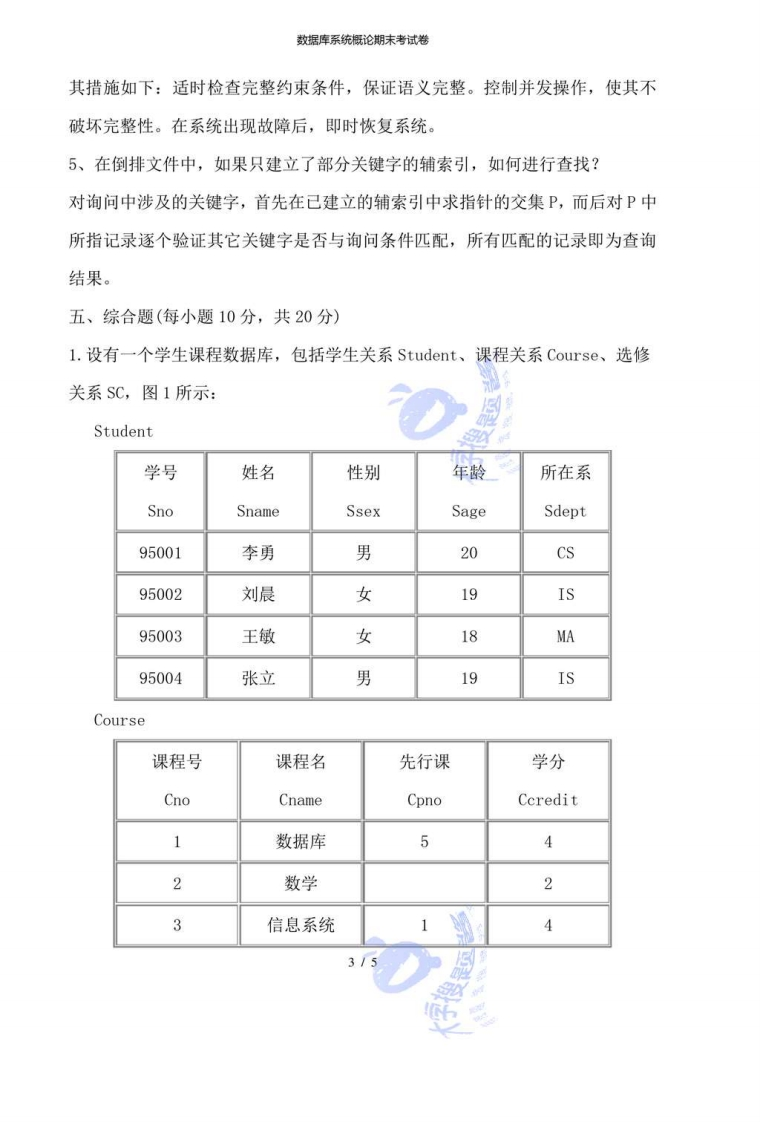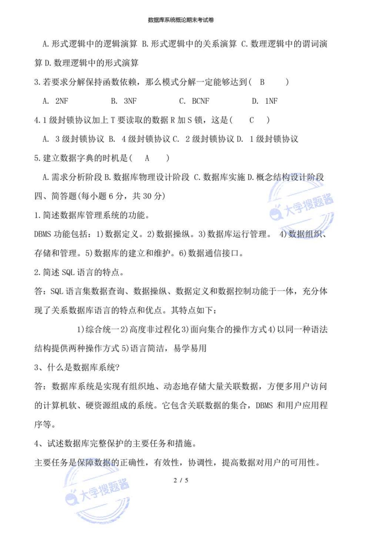 数据库系统概论期末考试卷《数据库系统概论》期末考试卷一、填空题(每空1分,共20分)》1.实体之间的联系按照联系方式的不同可分为一对一一对多和多对多2.数据库系统的核心是数据库管理系统(DBMS):3.在关系模型中,实体以及实体间的联系都是用关系来表示的。4.在关系代数中专门的关系运算包括选择、投影、连接、除等运算。5.1975年由IBM公司的M.Z1oof提出的QBE语言是一个很有特色的域关系演算语言。6.SQL语言集数据查询、数据操作、数据定义和数据控制功能于一体,充分体现了关系数据语言的特点和优点。7.数据库管理系统保证数据安全的主要措施是进行存取控制。8.人们已经提出了许多种类型的数据依赖,其中最重要的是函数依赖和多值依赖。9.关系模式由3NF转化为BCNF是消除了主属性对码的部分函数依赖和传递函数依赖。10.数据库设计应包括两个方面的内容:结构设计和行为设计。11.CGI规范允许Web服务器执行外部程序,并将它们的输出发送给浏览器。12.数据库技术与面向对象技术相结合,形成了面向对象数据库系统。二、单项选择题(在每小题的四个备选答案中,选出一个正确答案,并将正确答案的序号填在题干的括号内。每小题4分,共20分)1.数据库类型是按照(B)来划分的。A.文件形式B.数据模型C.记录形式D.数据存取方法2.关系演算的基础是(C1/5