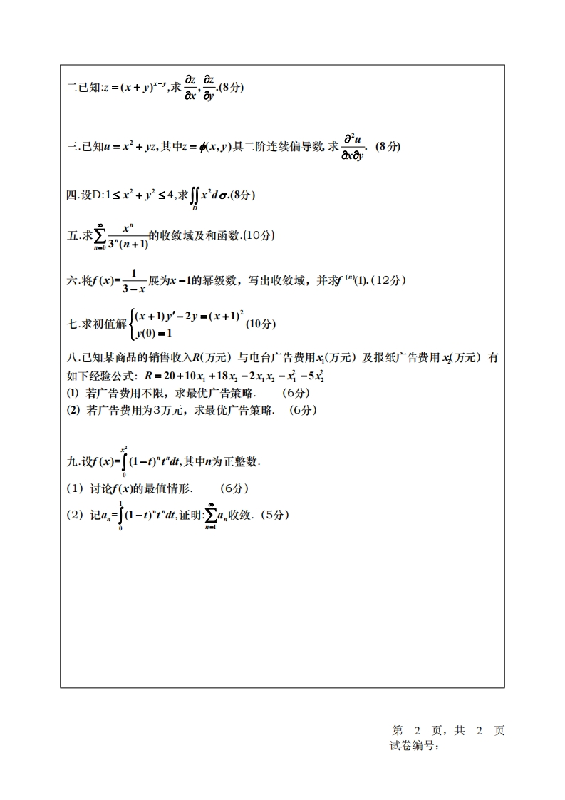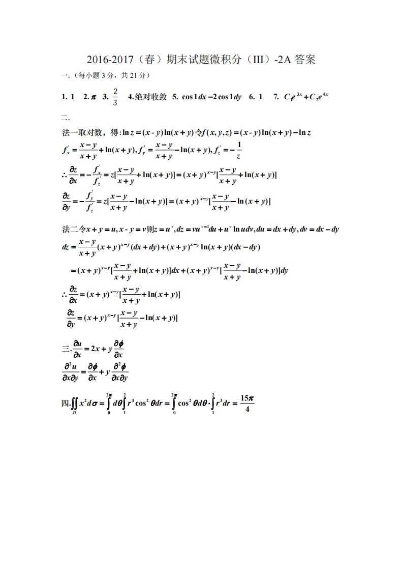 四川大学期末考试试题(闭卷)A卷(2016-2017学年第2学期)课程号:201077030课序号:课程名称:微积分(Ⅲ)2任课教师:成绩:适用专业年级:学生人数:印题份数:学号:姓名:考生承诺我已认真阅读并知晓《四川大学考场规则》和《四川大学本科学生考试违纪作弊处分规定(修订)》,郑重承诺:1、已按要求将考试禁止携带的文具用品或与考试有关的物品放置在指定地点:2、不带手机进入考场:3、考试期间遵守以上两项规定,若有违规行为,同意按照有关条款接受处理。考生签名:注:请将答案写在答题纸对应的方框内,否则记0分。一.填空题(每题3分,共21分)1.xedx =-2.1+x23已知级数2u的部分S,2n-33n-2’的敛散性为一填‘绝对收敛’或‘条件收敛’5.函数z=siny2在(1,-1)处的全微分为-------6.设D:r轴y=1,y=x所围区域,则∬2do=---7.方程y"-7y'+12y=0的通解为第1页,共2页试卷编号: