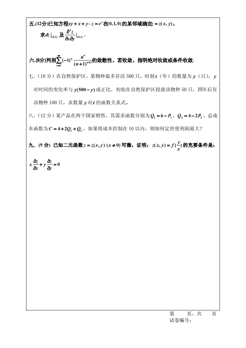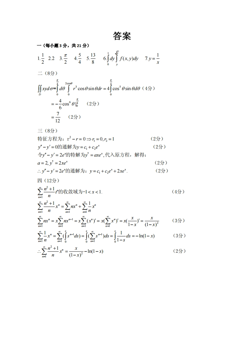 四川大学期末考试试题(闭卷)(2017—2018学年第2学期)A卷课程号:201077030课序号:课程名称:微积分(Ⅲ)2任课教师:成绩:适用专业年级:学生人数:印题份数:学号:姓名:考生承诺我已认真阅读并知晓《四川大学考场规则》和《四川大学本科学生考试违纪作弊处分规定(修订)》,郑重承诺:1、已按要求将考试禁止携带的文具用品或与考试有关的物品放置在指定地点:2、不带手机进入考场:3、考试期间遵守以上两项规定,若有违规行为,同意按照有关条款接受处理。考生签名:填空题(每题3分,共21分)l.∫xer=2y=∫(2-0的极大值是3.由y=0,x=1,y=Vx所围平面区域绕轴旋转一周,所得立体的体积为4已知级数4,的部分和3-2,则2=+25.利用e的幂级数求√e的近似值(计算前三项)为6.交换积分f(x,)的次序,其结果为y+=07方程的解是」J1)=1二8分)求do.D=x,y=0,(x-)+y2=1在第一象限所围区域三(8分)求”-y'=2e的通解巴02分漆空”:的收数装及和函数第页,共页试卷编号: