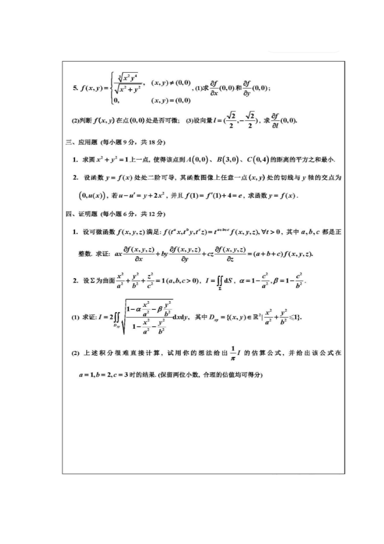 四川大学期末考试试题(闭卷)(2017一一2018学年第2学期)A卷课程号:201138040课序号:课程名称:微积分(1)-2任课数师:咸绩:适用专业年级:学生人数:印题份数:学号:姓名:考生承诺我已认其阅读并知晓《四川大学考场规则》和《四川大学本科学生考试违纪作弊处分规定(修订)》,郑重承话:1、己按要求将考试禁止携特的文具用品或与考试有关的物品放置在指定地点:2、不带手机进入考场:3、考试期间连守以上两项规定,若有违成行为,同意按照有关条款接受处理。考生签名:注:考试时间120分钟。请将斧案与在容题纸规定的方本内,否知品0分一、计算题(每小题3分,共3和分)1.求曲线x=cos,y=sn1,:=1cos1上点(L,0,0)处的切线方程2.求曲面:=y在点(-2,-3,可处的切平面方程3.设D=《x,)eR1x+≤1x0,J>≥0,求∬xd山4设口是曲面x=√2+少F与平面:=1围成的区域,求∬(e+xy'mdk5.设Γ是起点为L,0,)、终点为(0,1,)的有向线段,求(2+:-xr6求徽分方程初值问题灯-y=x2的解51)=2018二、解客题(每小题8分,共40分)1交换二次积分I=广drFe'd的积分次序并计算L.2.设曲线工的方程为[x2+y2+2=1r++:=0,米(x+y.3.设平面线L为=2-,起点为.点为(-3,求灯x2+y214.设由面2是球面:=√2-x2一y产与维而:=√x之+少2围成立体的表面,Σ的方向指向外侧,求∬x'ddz+y'dadx+-dd.