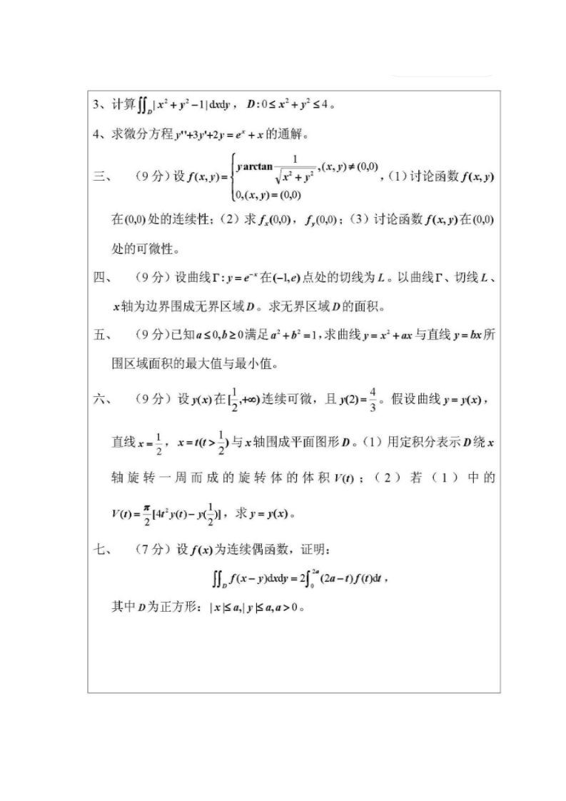 四川大学期末考试试题A(闭卷)(2016-2017学年第2学期)课程号:201075030课序号:课程名称:微积分(Ⅱ)-2任课数师:成绩:适月专业年级:学生人数:印题份数:学号:姓名:考生承诺我已认真阅读并知晓《四川大学考场规则》和《四川大学本科学生考试违纪作弊处分就定(修订)》,郑求承诺:1、已核要求将考试禁止换带的文具用品或与考试有关的物品放置在指定地点:2、不蒂手机进入考场:3、考试期问遵守以上两项规定,若有违规行为,同意按照有关条款接受处耳:考生签名:(3x7=21分)填空题1、sintdr2、limx3、im(x2+y2)sinx2+y24=e'dx的解为LJ0)=05、二重积分川m(x2+2dd的符号为。(填正或负)6、1=广三x+x,交换积分次序后,17、设=yfr-y),则+1=xax yoy二、(9X436分)计算题1、计算4-x。2、计算dre。
