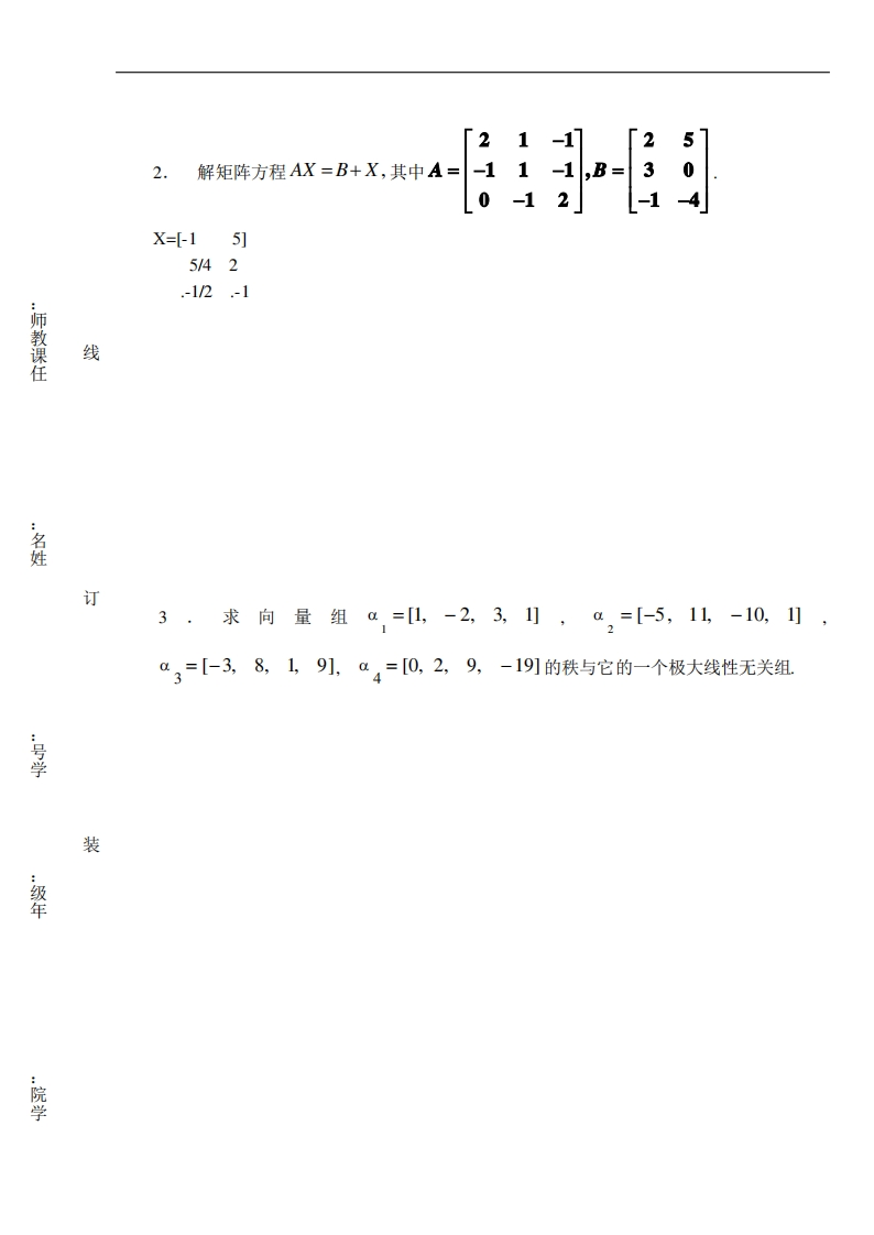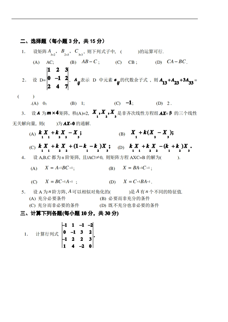 四川大学期末考试试卷A2019-2020学年第二学期科目:《大学数学》(线性代数)适用专业年级:四川大学数学一、二类各专业本科生题号二三四五总分师教课任线得分考试须知四川大学学生参加由学校组织或由学校承办的各级各类考试,必须严格执行《四川大学考试工作管理办法》和《四川大学考场规则》有考试违纪作弊行为的,一律按照《四川大学学生考试违纪作弊处罚条例》进行处理。:名姓四川大学各级各类考试的监考人员,必须严格执行《四川大学考试工作管理办法》、《四川大学考场规则》和《四川大学监考人员职责。有违反学校有关规定的,严格按订照《四川大学教学事故认定及处理办法》进行处理。一、填空题(每小题3分,共15分)4a2a3:号学1.b ba b3=abc0C C2 C32.向量组“1=2-5,“2=2,01),“3=2,3,10,04=(7,8,-1山)线性_装相关鞶T37813.设A=01-2A是A的件随矩阵,则1-5A=L00-24.当t满足」的条件时,f(任2七)=21+红2+2x?+2x,2为正定二次12型。院学5.设A,B都是3阶矩阵,秩(A)=3,秩(B)=1,C=AB的特征值为1,0,0,则CAB是相似对角化.