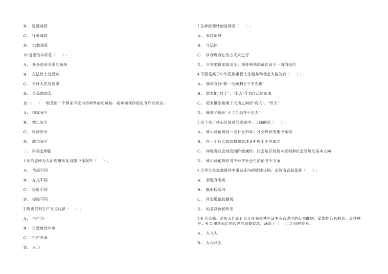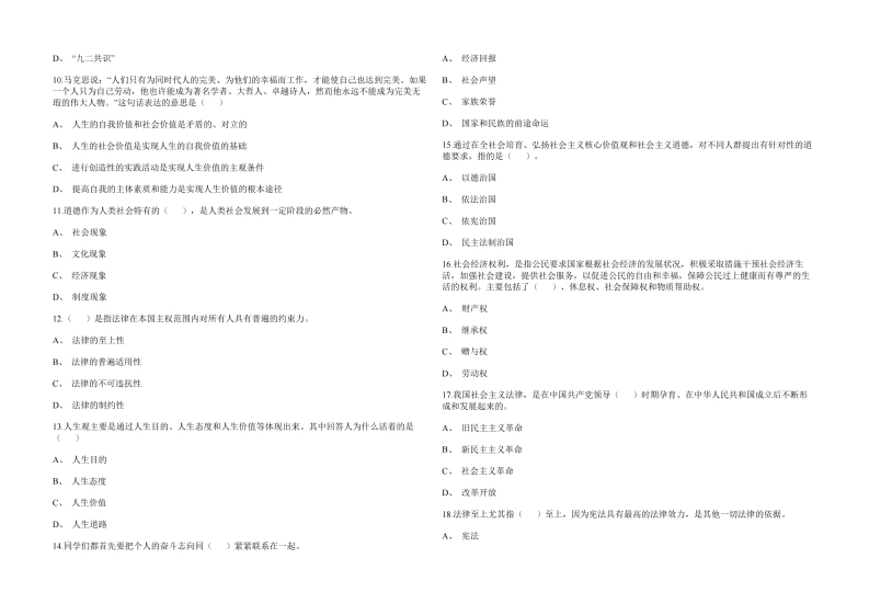 苏州大学《思想道德与法治》2222023年第一学期期末试卷A、斯烟一、单项选择题B、老爱1.法律显序的()是指案得成纠粉的利害关系人都有机会进入办案程序,充分表达自己的利登C,情侣诉装和童见主张,为解决纠纷发挥作用.D、家庭A、中立性6.在我国,可法机关是指国家审列机关和粒察机关,()代表国家行使审判权。B、参与性A,公安同C、公开性B、人民检察院D、时限性C、人民法院2社会公遗是指人们在社会交往和公共生话中应该遵守的(》,D,质就A、法律准测7144年,毛泽东在纪念革命橇士张思德时,明确以()作为对张思德及一切革命者的崇高品B、职业要求面的餐括C,家庭美德A,实事求是D、行为准则B、为人民服务3下列关于社会价值与白我价值的关系理解情误的是()C、理论联系实际A,社会价值的创造过程与自我价值的实现过程是辣一的D,不屈不挠的革命精神B、人生的自我价值经须与杜会价值相结合,并通过社会价值表现出家8.()是联系理想与观实的桥果。C、不创造杜会价值,就无从实现自我价值A、实我D、实现白我价值是因,创造社会价值是果B、理论研究4社会成员素质的不斯提高是社会发展的重要基黜,推动和实现〔》是社会发展的根本目标,C,人际交往A、物质丰富D、思想现念B、人的全面发属9.两岸双方应始终坚持〔)的共同立场。在巩围和隆护一个中国版架这一顺则间愿上形成更为清所的共同认知。井在此基础上求间存异。C、经济繁荣A、大陆完法D、旺凌消费B、社会主义5.《)是指由法律所确认的男女两性的结合以及由比而产生的夫基关系。C,年重历史