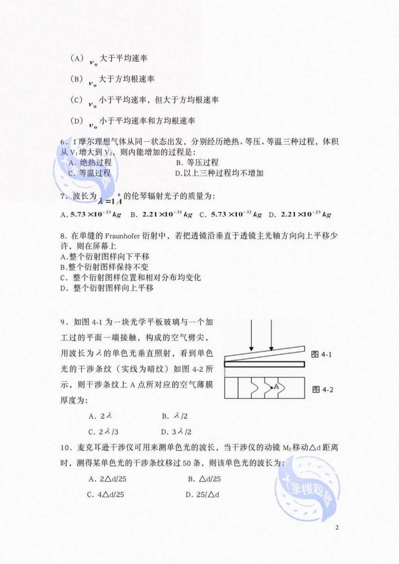 太原工业学院《大学物理》2020-2021学年第一学期期末试卷(常量:h=6.63X101s’6=8.85X10Fm,R=8.31/m0l'K一、选择题(每小题3分,共42分)题号234567891011121314答案1.一质点作简谐振动,周相为T,当它由平衡位置向x轴正方向运动时,从12最大位移处到最大位移处这段路程所需的时间为:A.TB.c.374D2.两个同方向、同频率的简谐振动,其振动表达式分别为:x,=6×102cos(51+),X=2×102sin(π-50)(S),它们合振动的振幅和初相分别为:A.4×102m,严B.4×10m,7c.3×102m7D3×102m:33.关于波速的传播下列说法正确的是:A.质点振动的速度等于波速B.波形传播的速度等于波速C.波速的大小与波源有关D.波速的大小与弹性介质的性质无关4.在标准状态下,若氢气和氨气(视为理想气体)的体积比上=!,其内能之比为大学搜题V.2A.1:2B.10:3C.5:6D.4:35.图2为Maxwell分子速率分布曲线,图中,为最可几速率,则%图2