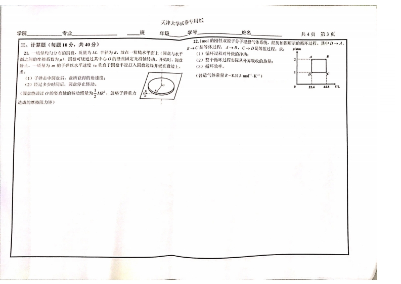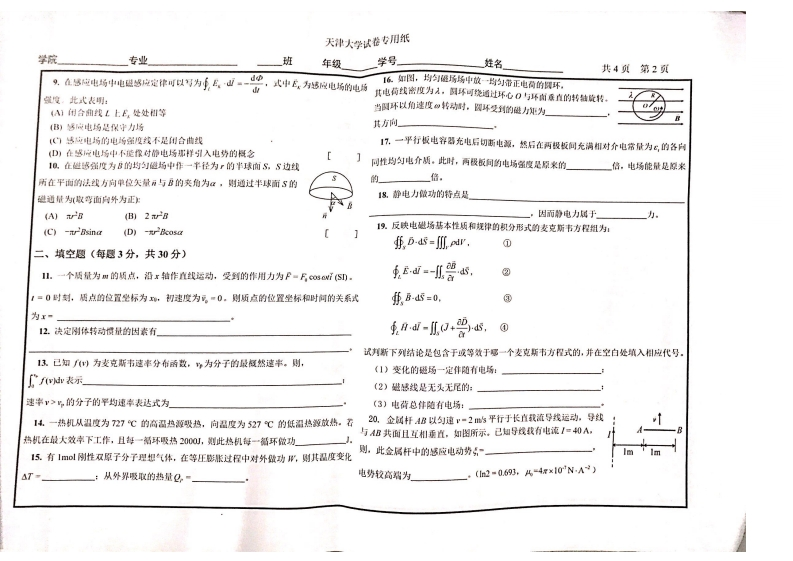 天弹大学试卷专用纸学院专业班年级学号姓名共4项第1页2019~2020学年第二学期期末考试试卷5一一定量的肚想气体,在体机不变的条件下,当温皮降低,分子的平均好撞频南2和平均口由程不的变化情况是:《大学物理1AW2A》(A卷)(共4页)Z减小,但万不变B)2不变,但无减小(考试时间:2020年9月13日)(C)2和万都诚小D)2和万石不变地写三421)兰22)兰23)三24)成锁核分人签字6,根据热力学第二定律可知:斜分)功可以完全书换为热,但热不能全密书换为功一、选择题(每小题3分,共30分)B)热可以从高温物体传到低温物体,山不能从妖温物体传到岛温物体1,餐点作半径为京的变速具风运动时的速度大小为《:表示任一时刻明点的速率):©)不可逆过程线是不能响相反方向进行的过程D)一切白发过程都是不可连的山1.图示为一具有球对称性分右的静电场的E一r关系曲线,2.如图所示,一量止的均匀细蒋,长为L、质量为M,可绕通过请智出该静电场是血下列愿种带电体产生的:特的编点且垂直于桥的光滑固定轴O在水平面内转动。转动惯量为()事径为R的均匀带电球南()半径为虎的均匀增电球体心/3。-一质量为网,建率为r的子弹在水平面内沿与样稀直的方用w名:(C半径为R,电荷体密度为P=A/2《,A为常数)的辈均匀量电眼体向射入并穿出棒的白白瑞。设穿过棒后子弹的速卡为/2,划此时棒的角速度应为:(D)半径为是。电背体密度为P=A/r《A为宗数)的非均匀带电球作)1亿o疆家在图a)和b)中各有一半径相同的圆彩回浴1,,园周内有电流小,:其分布相同。且均在真空中,但在图中:国路外有电流,、乃为两四形溶上3一顷点在如图所示的坐标平面内作圆周运动,有一力的对应点。则:P一(+)作用在质点上,在该场点从坐标原点运动到W重B=重Bd、民-《0.2R)位置过程中,力F对它所做的功为:围重,Bd-重Bd.a-b(A)FR (B)2E8 (C)3E&(D)4E89,d=重原d.品D0重B山*5B山民*民4在点电荷+y的电场中,若取图中P点为电势零点,则点的电势为:
