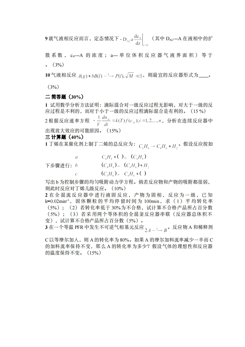 天津大学2019-2020学年上学期化学反应工程试卷(A卷)》题号三四五总分得分超填空题(30%)1反应体系存在下列反应:CO+2H,CH,OH:CO,+3H,CHOH+H,O;CO,+H,=CO+H,O聚则该反应体系可由个参数对其组分间进行关联。(3%)2间歇反应器物料恒算方程~)=.(A-反应组分)成立的条件是过程d(3%)3连串反应:A+A-上一4旧的产物)-2一A(副产物)°k=kopRTk,=k2n exp则温度有利于目的产物收率的提高。(3%)RTE>E,絮4气固相催化反应Thiele模数g=k.c其物理意义为SD(3%)5活塞流反应器物料恒算方程r)=N成立的条件是过程为d(3%)6间歇反应器中进行两个平行的不可逆反应A+4,-一A,:A+A,一一A'其中r=k expEEE>E2,则为了提高RTr=kzo expRTA:的选择性,应该采取的合适工艺条件是(3%)7在CST反应器中进行二级固相反应,则固相的平均出口转化率表达式为(3%)】8拟一级气液相反应A(g)+bB)-一P):M=62k的物理意义为(3%)
