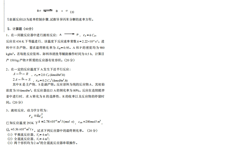 天津大学2020-2021学年上学期二、填空题(15分,每空1分)化学反应工程试卷(A卷)】1、气相反应A+B→3P+S进料时无惰性气体,A与B以1:1摩尔比进料,题号三四五总分则膨胀因子δ4=2、所谓“三传一反”是化学反应工程学的基础,其中“三传”是指得外和一“一反”是指3、测定非理想流动的停留时间分布函数时,两种最常见的示踪物输人单项选择题(10分,每题2分)方法为和平推流反应器的Pe、N、c2,值分别为()4、气一固相催化反应的内扩散的影响程度可以用梯尔模数中的大小来.0、0、1;B.o、0、0C.0、o、0D.∞、o、0判别。中愈大,则粒内的浓度梯度就越内扩散的影响程度越级连串反应A→P→S在间歇式反应器中进行,使目的产物P浓5、偏离全混流、平推流这两种理想流动的非理想流动,E()曲线的度最大时的反应时间'w=().方差为1In(K /K2)E6、全混流反应器的返混为,平推流反应器的返混为B.K·K7、气体在固体表面上的吸附中物理吸附是分子层的。而化学In K2/K)In(K/K吸附是分子层的。KK2D.2K对于可逆放热反应。为提高反应速率应()8、四只相同体积的全混釜串联操作,其无因次停留时间分布的方差:高压力B.降低压力C.提高温度D.降低温度为:一液相反应中的膜内转化系数M在()范围内,反应几乎全部液相主体内进行的极慢反应。三、推导题(15分)<0.02B.0.022D.>21、在Pt催化剂上进行异丙苯分解反应:CeHsCH(CH3:2±CeHs C3He、无于单一反应组分的平行反应义,),其解间收率X,随C增大以A,B及R分别表示异丙苯、苯及丙烯,反应步骤如下:而单调增大,则最适合的反应器为()。A+0产A0()k.平推流反应器B.全混流反应器、,多釜串联全混流反应器D.全混流串接平推流反应器A0产B0+R(2)第页
